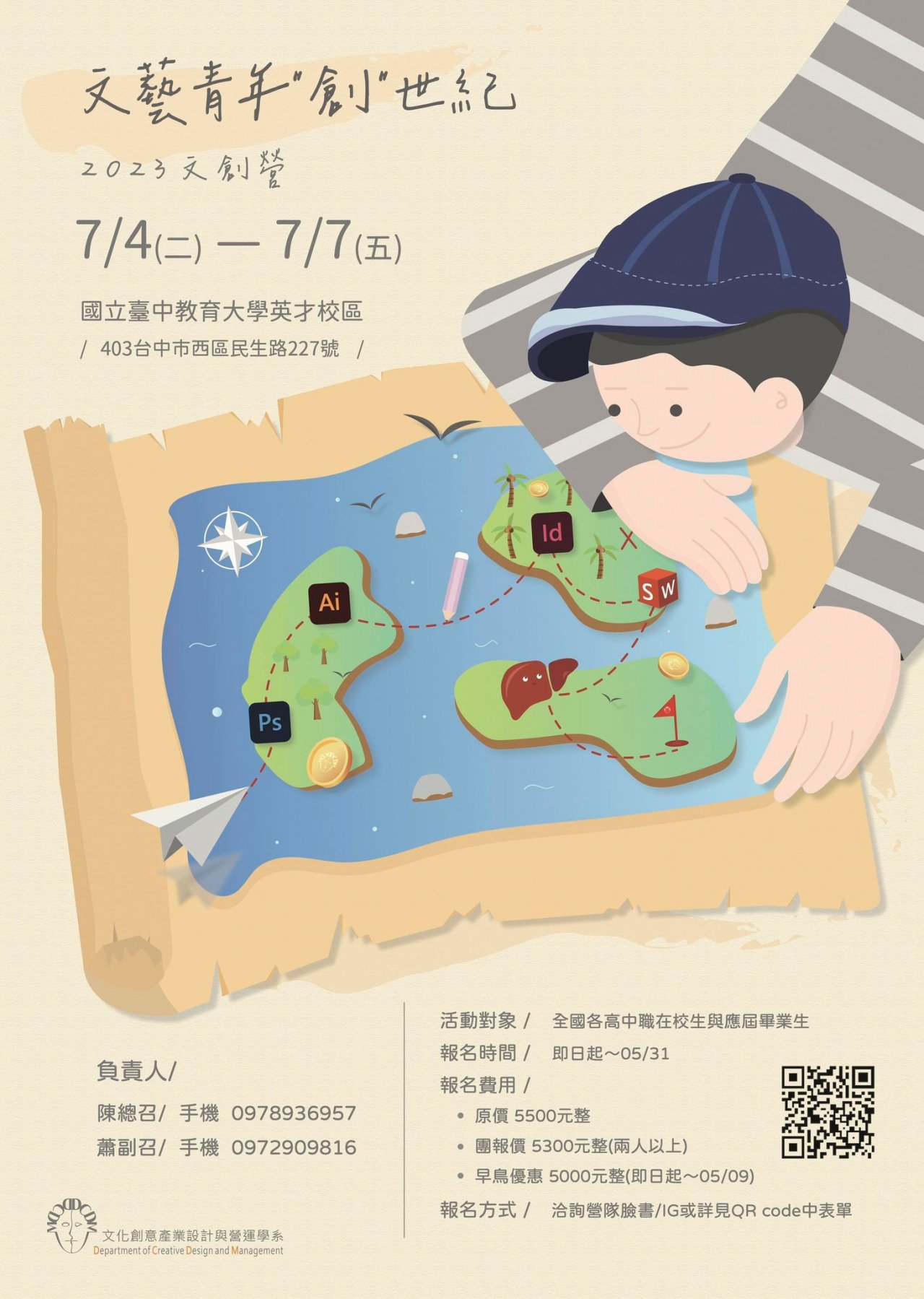 一、本校文化創意產業設計與營運系將在 2023 年 7 月 4 日~7 日於本校英才校區舉辦「藝文青年"創"世紀」暑期高中營隊,提供高中學子認識文創設計結合營運管理的機會,活動內容綜合跨域(設計與管理)學習,涵蓋理論與實務操作。