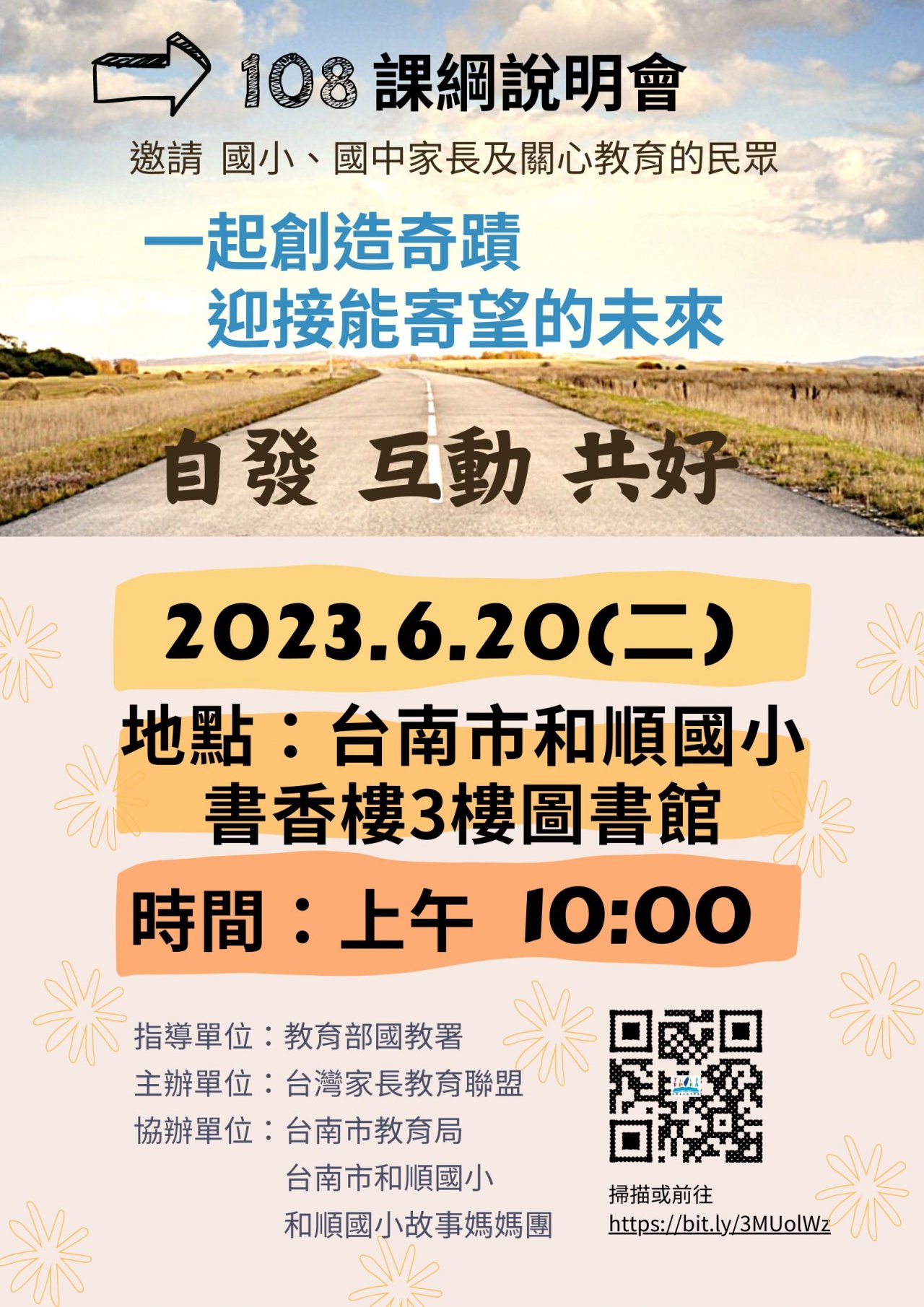 一、依據台灣家長教育聯盟 112 年 5 月 29 日台家盟愛字第 2023052901 號函辦理。 二、臺南場次預計 112 年 6 月 20 日(星期二)上午 10 時 00 分於臺南市安南區和順國民小學(書香樓 3 樓圖書館)舉辦,謹附活動相關資訊,請貴校公告活動訊息予教師及家長。 三、相關事宜未盡之處,請逕洽社團法人台灣家長教育聯盟秘書處 02-2368-5900 聯繫。