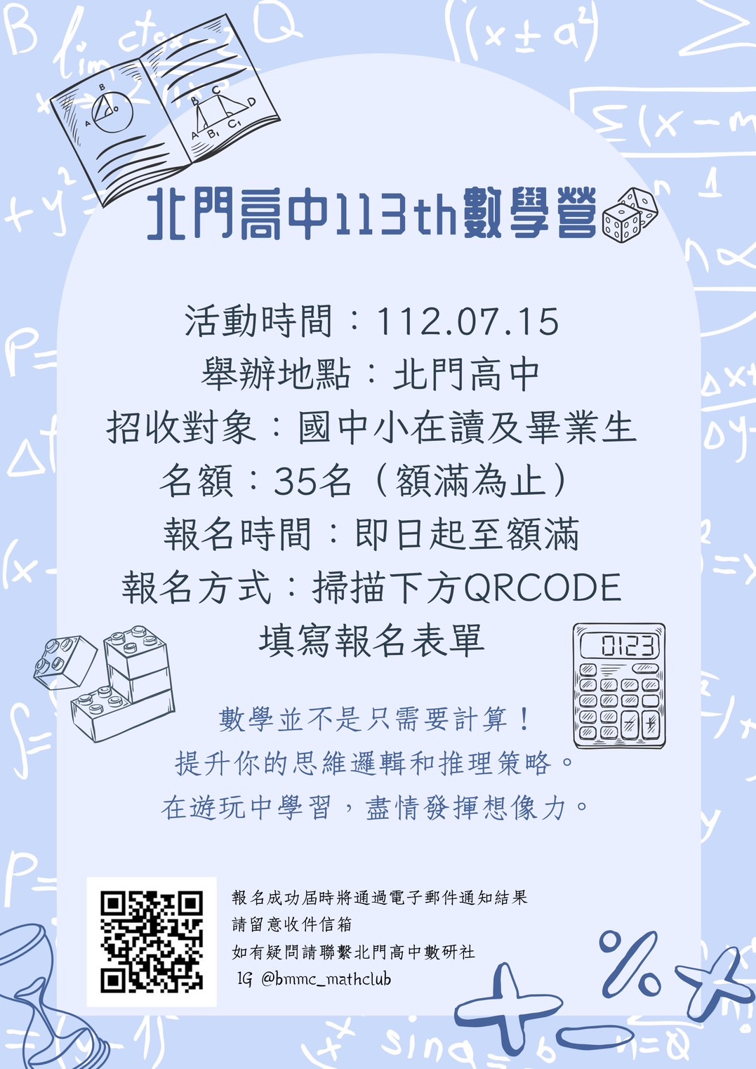 一、藉由辦理國中學生至高中參加學術試探動手實作活動,增加國中師生對學科課程之認識,高中老師亦可依據國中端之回饋意見調整日後授課目標及內容,國高中學習優質銜接不中斷。 二、對象:國中在讀學生及畢業生。 三、辦理時間: 112 年 7 月 15 日 8 時至 16 時。 四、報名網址: https://reurl.cc/51GMlq 。