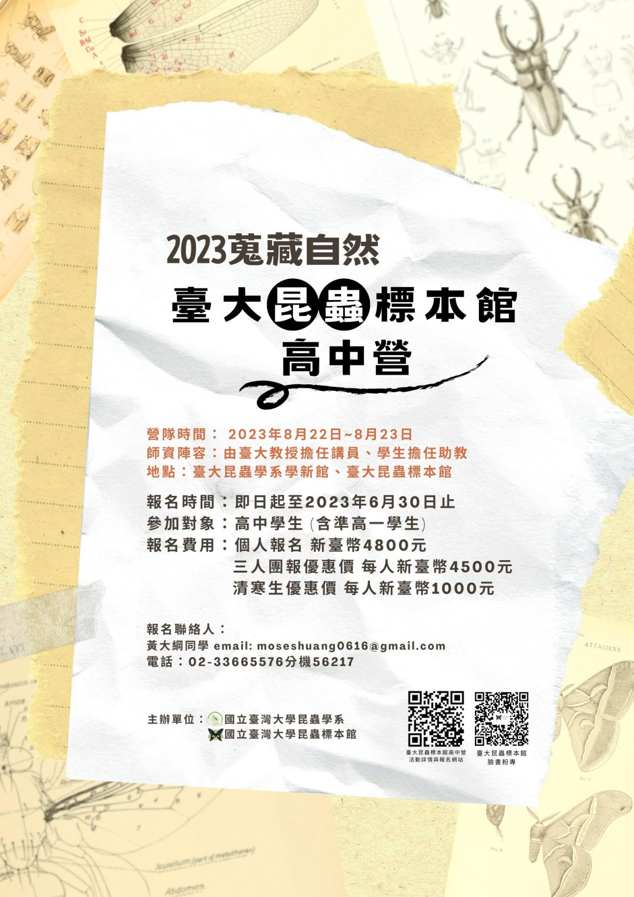 說明: 一、活動時間: 2023 年 8 月 22 至 8 月 23 日,活動地點為本校學新館與昆蟲館。 二、相關報名資訊如附件 1-活動海報、附件 2-報名簡章。 三、報名網址: https://www.beclass.com/rid=274b1806472e24fe6606