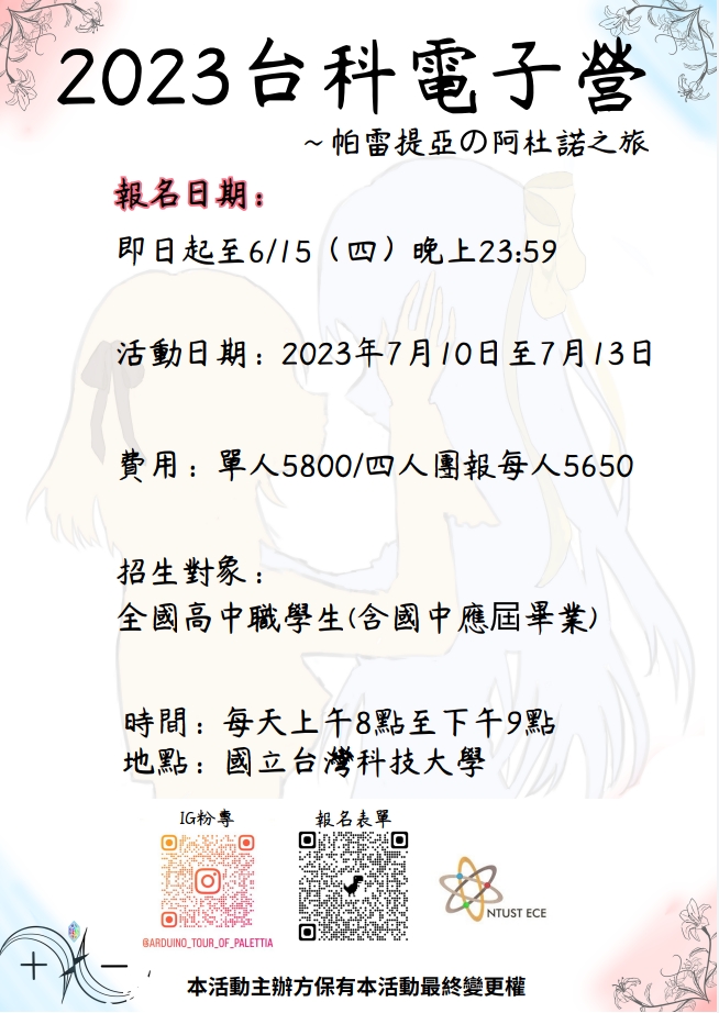 說明: 「2023 年台科暑假電子營」為期四天,除了讓放暑假的同學們放鬆遊玩, 也安排紮實的課程。帶領同學使用 C 語言在 arduino 板上製作屬於自己的 多功能時鐘,結合電子與資工的相關知識,讓同學對電資領域更加了解, 歡迎來探索並找到未來的志向(詳附件海報)。