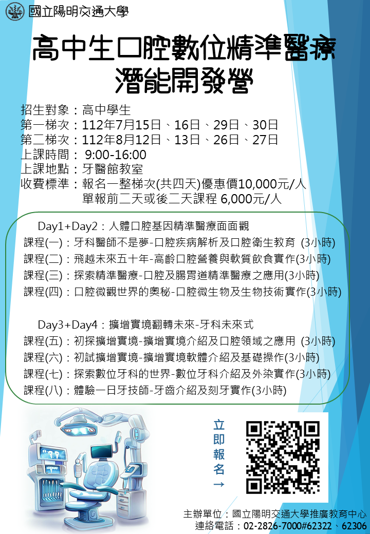 一、本校推廣教育中心針對全國高中生於 2023 年暑期 8 月辦理「口腔數位精準醫療潛能開發營」及「火箭與太空工程探索營」課程,希冀能夠啟發學員對口腔牙醫或太空領域方面之興趣。