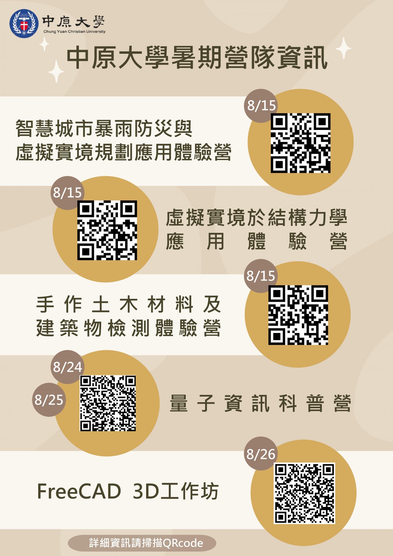 主旨:檢送本校 112 年 8 月舉辦「中原大學暑期營隊」海報 1 份及活動簡章 5 份,請惠予公告並鼓勵貴校學生踴躍報名參加,請查照。