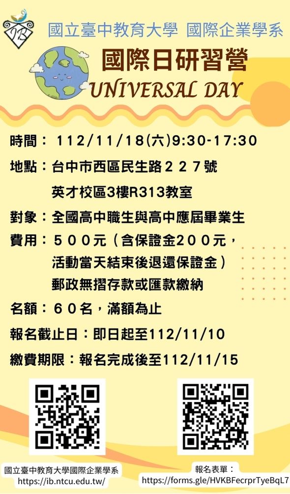 (一)直接在附件之國際日研習營海報或企畫書→掃描 QRcode 或至本系網頁 http://ib.ntcu.edu.tw/→最新公告→國際日研習營公告下方網址填寫”網路報名表單。