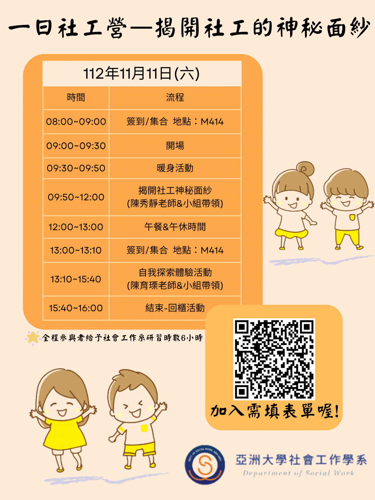 一、活動內容:一日社工營是以輕鬆的方式認識社會工作,非講授課程,將以小組討論、團體體驗活動、自我探索等方式,讓學生由外而內的更加認識社工行業與自己的決定。敬請將資訊轉發給有興趣的學生,讓高中職生有機會與大學社工系教師面對面探討何謂社會工作?社工在做些甚麼?社工與志工的不同?身為助人工作者的自我探索?本次活動全程免費,並會給予 6 小時的研習證書,歡迎盡速報名(112 年 11 月 8 日截止)。