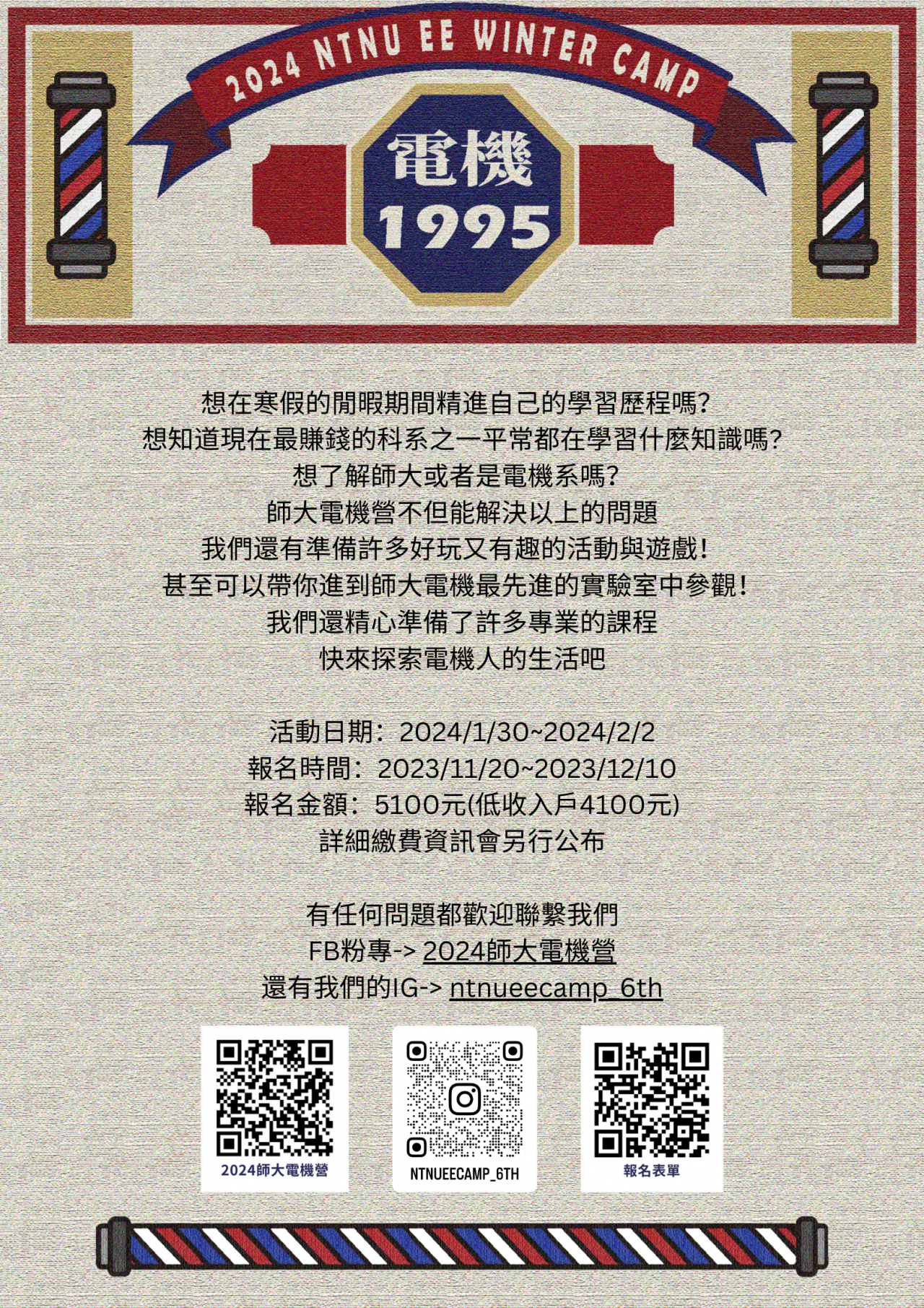 說明: 本次營隊活動日期為 113 年 1 月 30 日至 2 月 2 日, 預計招收名額為 48 名,詳細活動辦法請參考附件,亦可點選連結 https://www.facebook.com/profile.php?id=61553609271399 或是 https://www.instagram.com/ntnueecamp_6th/ 查詢。