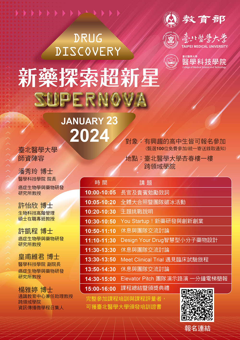 一、本校醫學科技學院潘秀玲院長團隊執行教育部補助大專校院 STEM 領域及女性研發人才培育計畫,設計適配高中生學習之「Drug Discovery Supernova 新藥探索超新星科普培訓計畫」課程活動,擬訂於民國 113 年 1 月 23 日(二) 10:00-16:00 於臺北醫學大學跨領域學院辦理,報名方式為線上報名,報名連結 https://pse.is/5f8s32 ,請欲報名者參見報名表內詳細資訊並填寫相關內容,報名截止日期為 112 年 12 月 31 日。