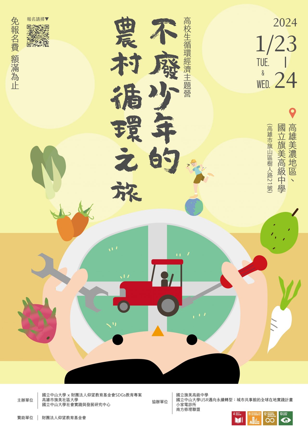 一、本營隊於民國 113 年 1 月 23 日至 1 月 24 日假國立旗美高級中學(高雄市旗山區樹人路 21 號)舉辦,透過講座、討論、參訪與實作,引領同學認識全球與在地的循環永續方案,建立「責任生產與消費」、「永續城鄉」、「氣候行動」等 SDGs 指標的能力。