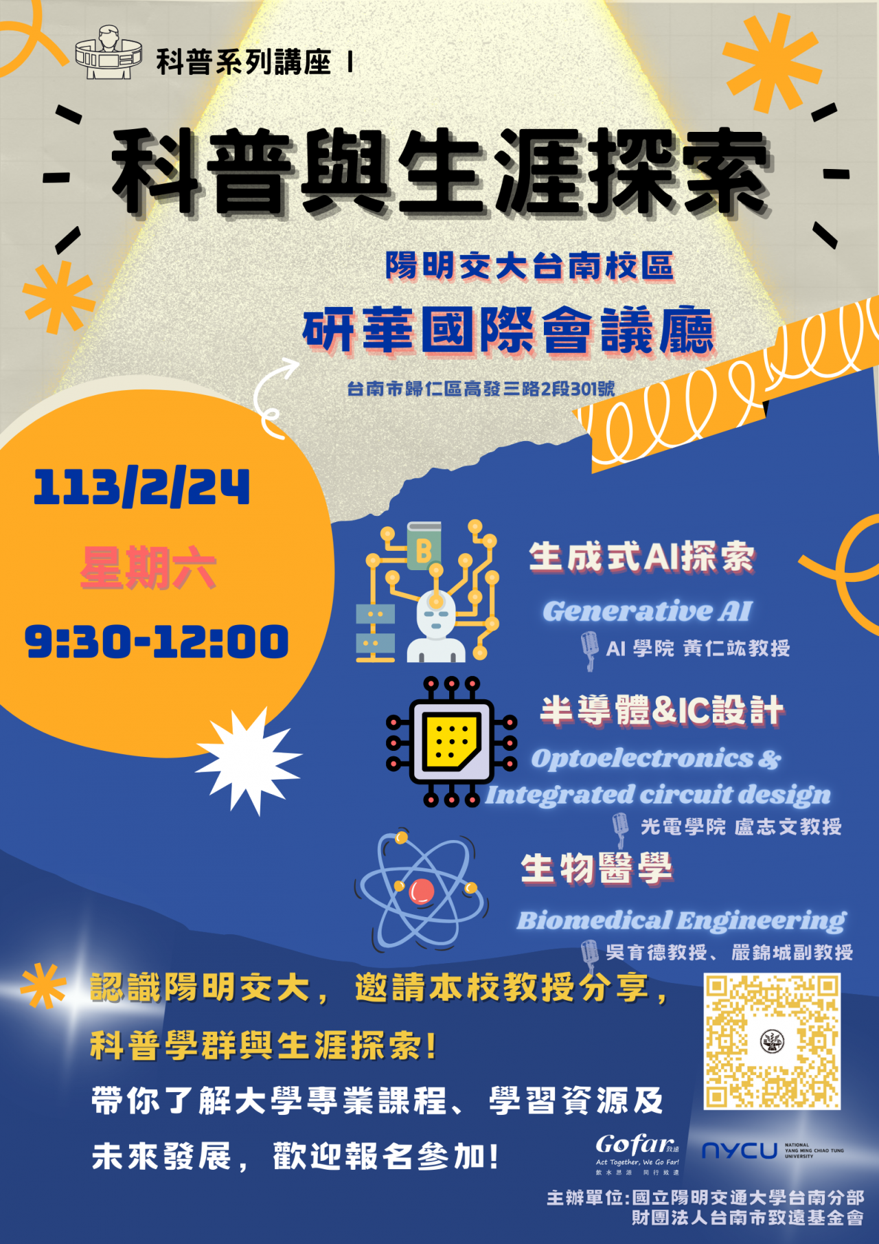 六、檢附講座活動海報供參。詳細科普系列活動請至活動網站 https://sites.google.com/nycu.edu.tw/gofar/首頁查詢、報名,或洽活動聯絡窗口:劉小姐(06)3032121 分機 57733 。