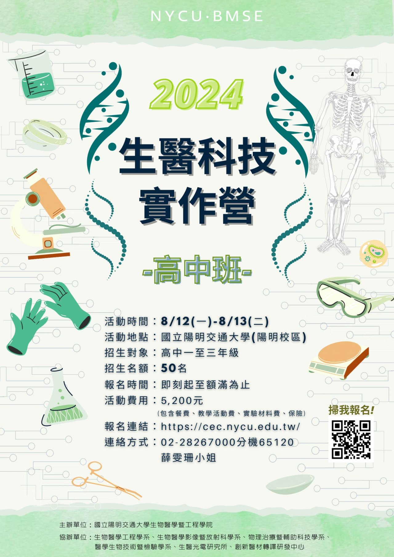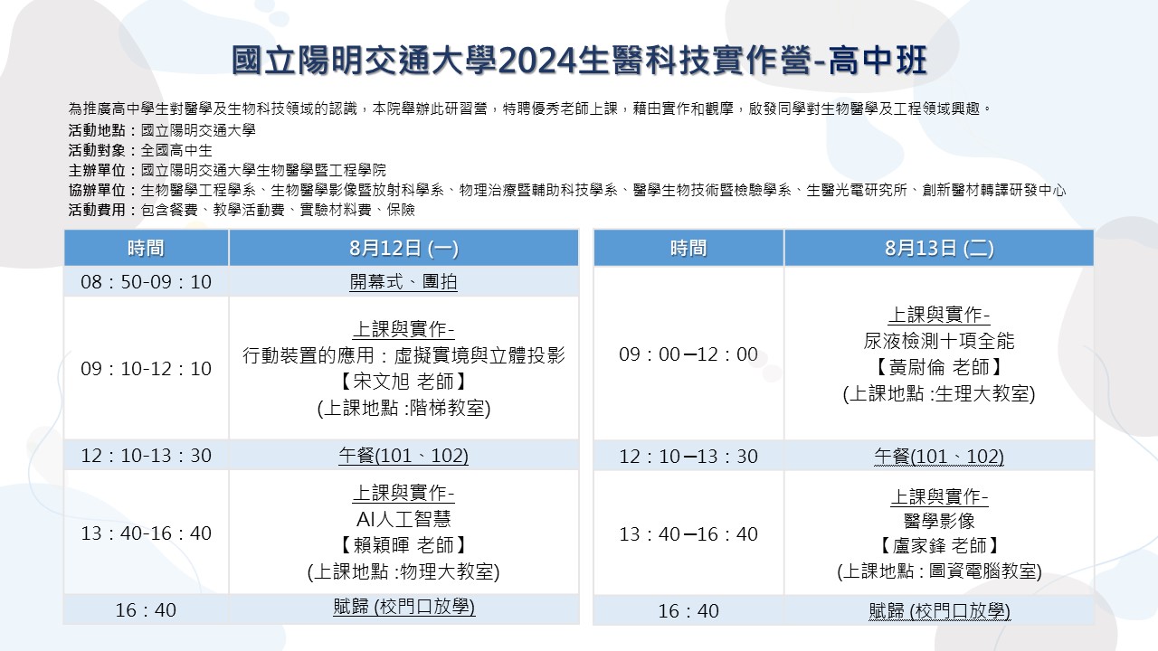 三、檢附「2024 生醫科技實作營」暑假梯次招生海報及課程規劃,敬請惠予公告宣傳,並鼓勵同學報名參加