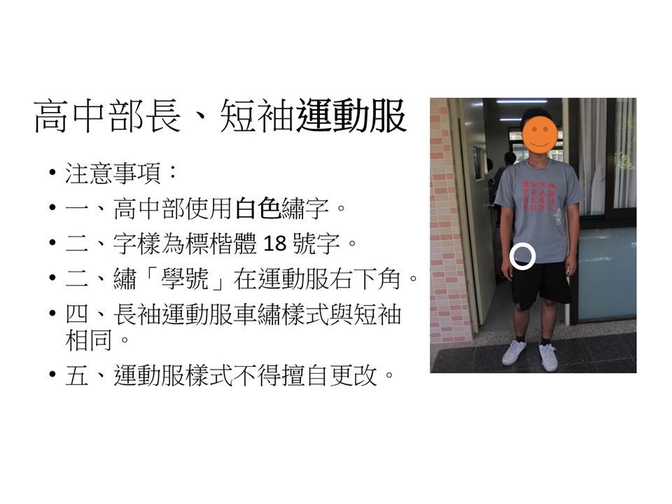 三、強烈建議橘色外套可一併電繡自己的學號或名字,國中部可同運動服繡紅色,高中部同學可同運動服繡白色,若發生遺失之情事,可迅速找回自己的外套。