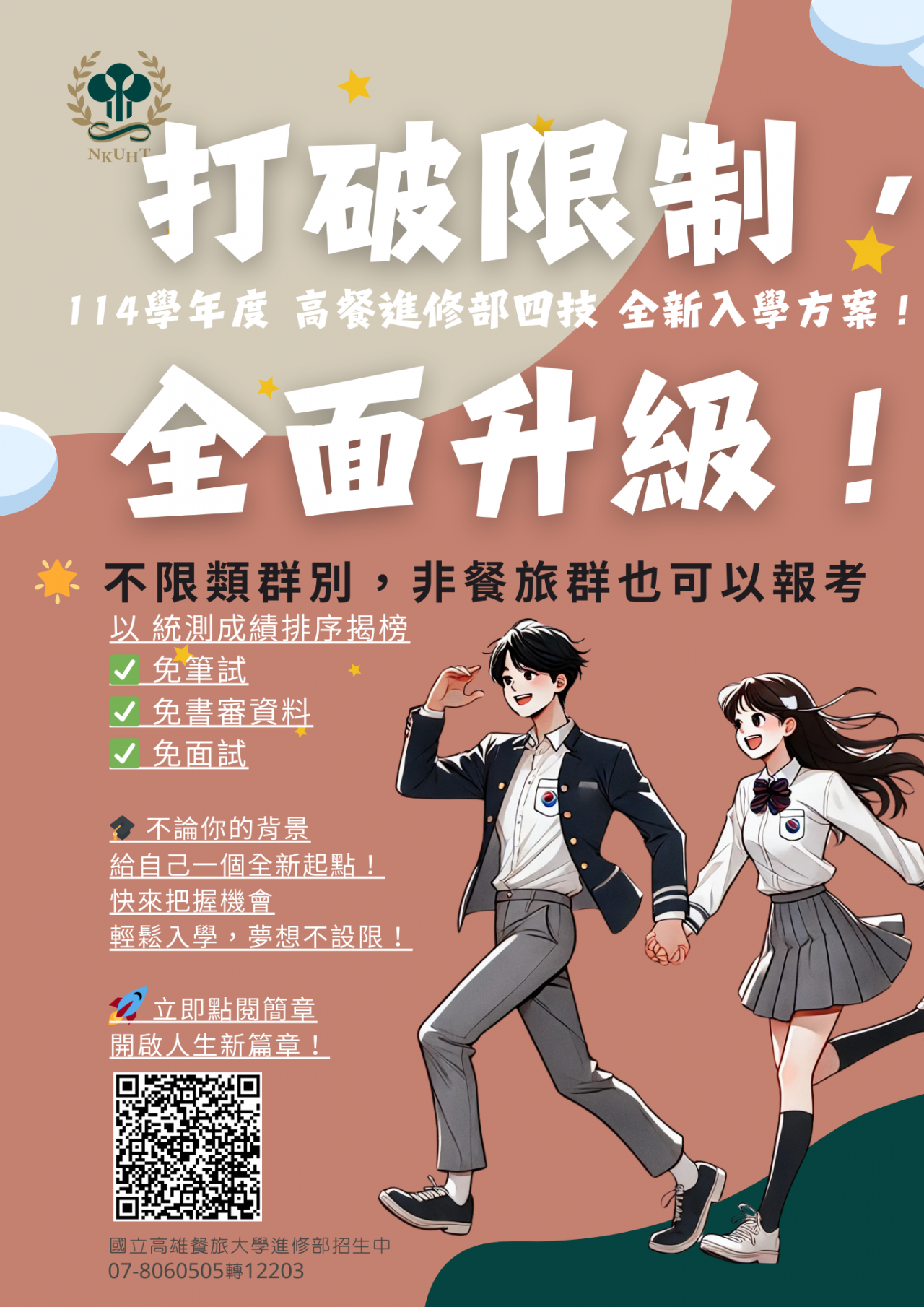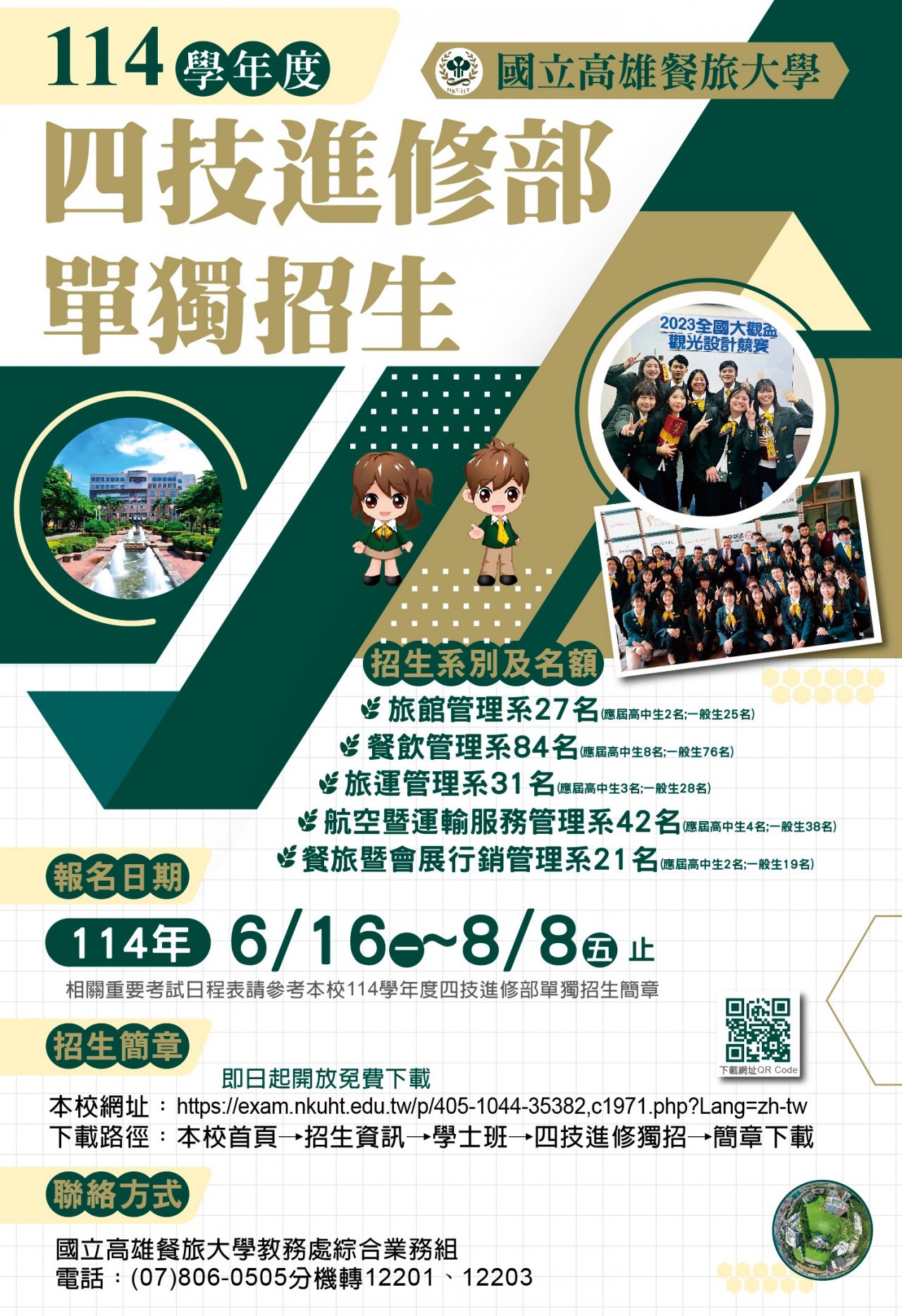 二、報考資格、招生學系與名額等詳細資訊請參閱本校招生簡章,公告於本校招生資訊網/學士班/四技進修獨招專區網頁( https://exam.nkuht.edu.tw/p/405-1044-35382,c1971.php?Lang=zh-tw )。