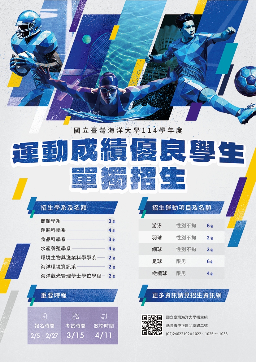 (二)招生學系及名額:商船學系 3 名、運輸科學系 4 名、海洋觀光管理學士學位學程 2 名、食品科學系 3 名、水產養殖學系 4 名、環境生物與漁業科學學系 2 名、海洋環境資訊系 2 名,合計 20 名。