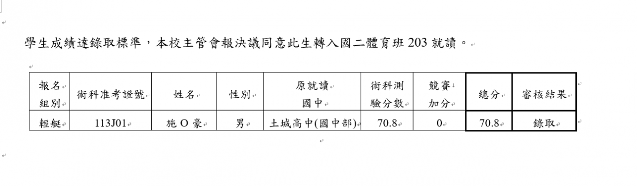 依據本校招生委會,經期末會議及期初主管會報審議通過, 113 學年寒假國高中體育班轉學轉班甄試成績符合錄取標準(詳見附件),特此公告。