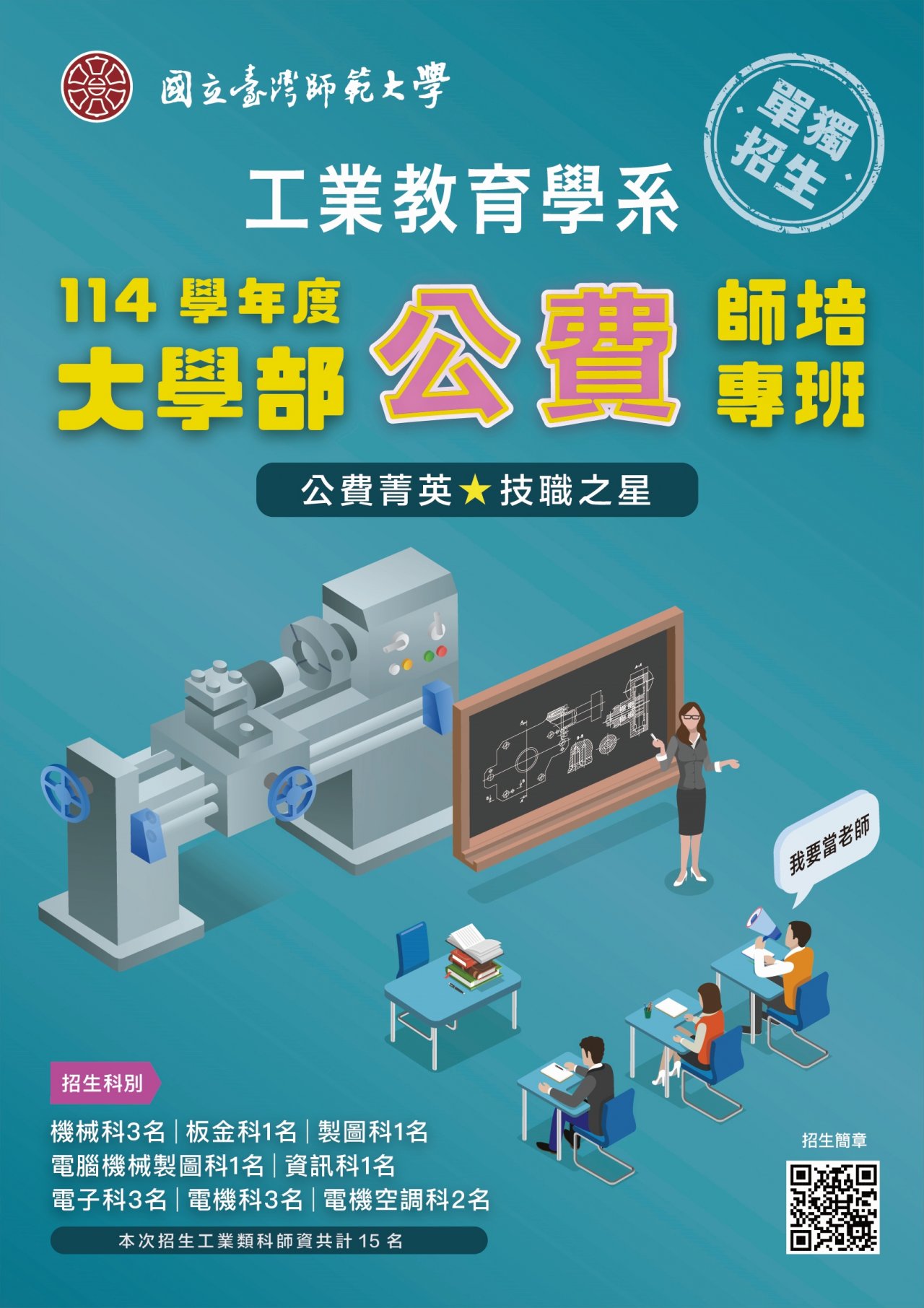 二、相關招生資訊,請參閱招生簡章或至本校工業教育學系公費專班網頁( https://reurl.cc/aZKAoQ )查詢。