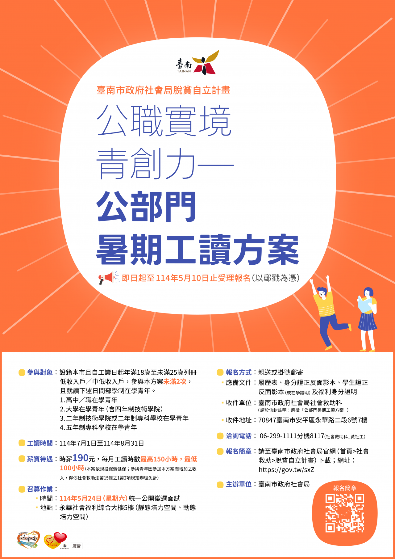 (一)「公職實境青創力—公部門暑期工讀方案」宣導單張,網 址: https://gov.tw/sxZ ;即日起受理報名至本( 114 )年 5 月 10 日。