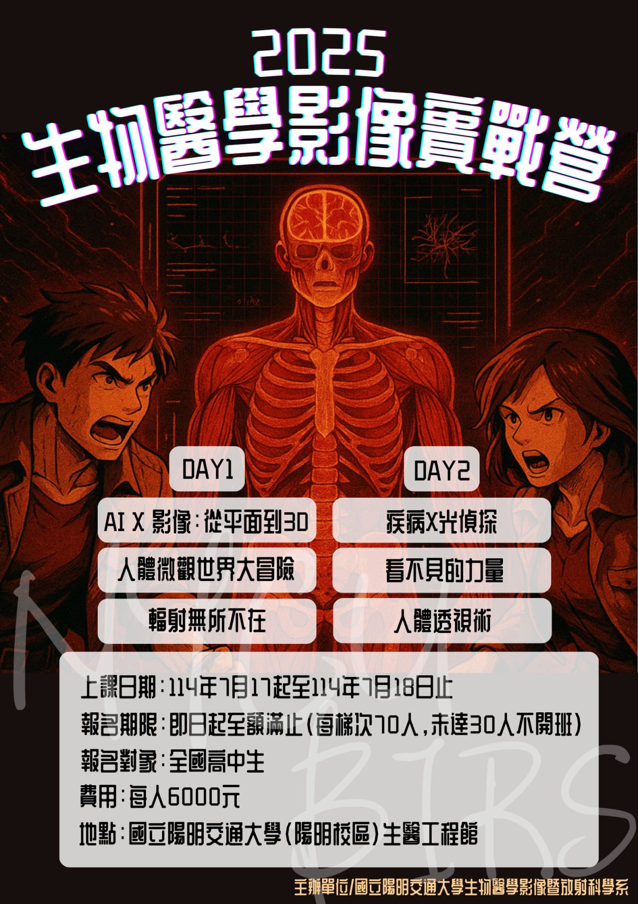 二、旨揭活動第一梯次營期為 114 年 7 月 17 日(周四)至 114 年 7 月 18 日(周五),共二日,詳情及報名資訊請上本校網頁查詢 https://cec.nycu.edu.tw/Course/CourseInfo?CId=82652 ;或電洽本系辦公室: 02-2826-7217 。