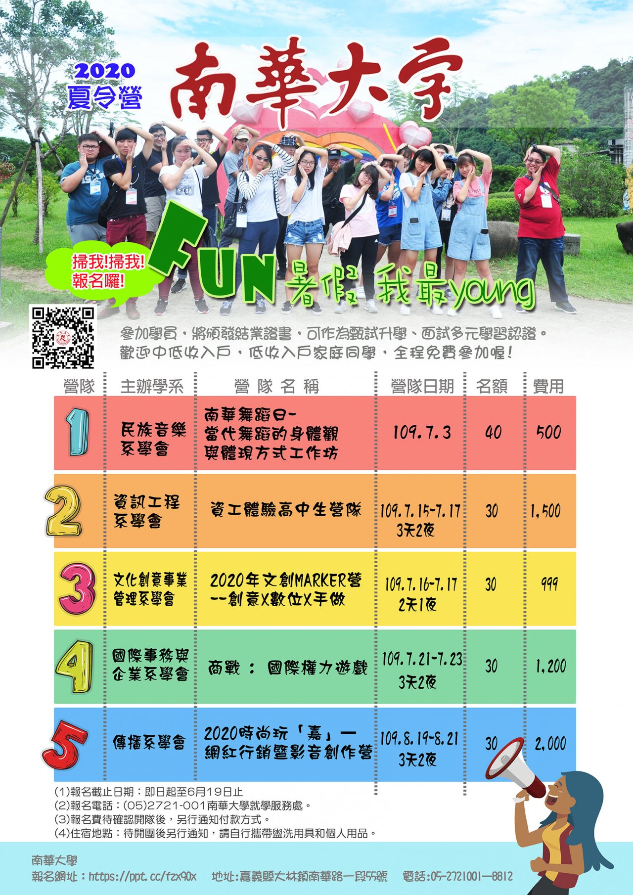 轉知:南華大學辦理「2020暑假高中生營隊活動資訊一覽表」