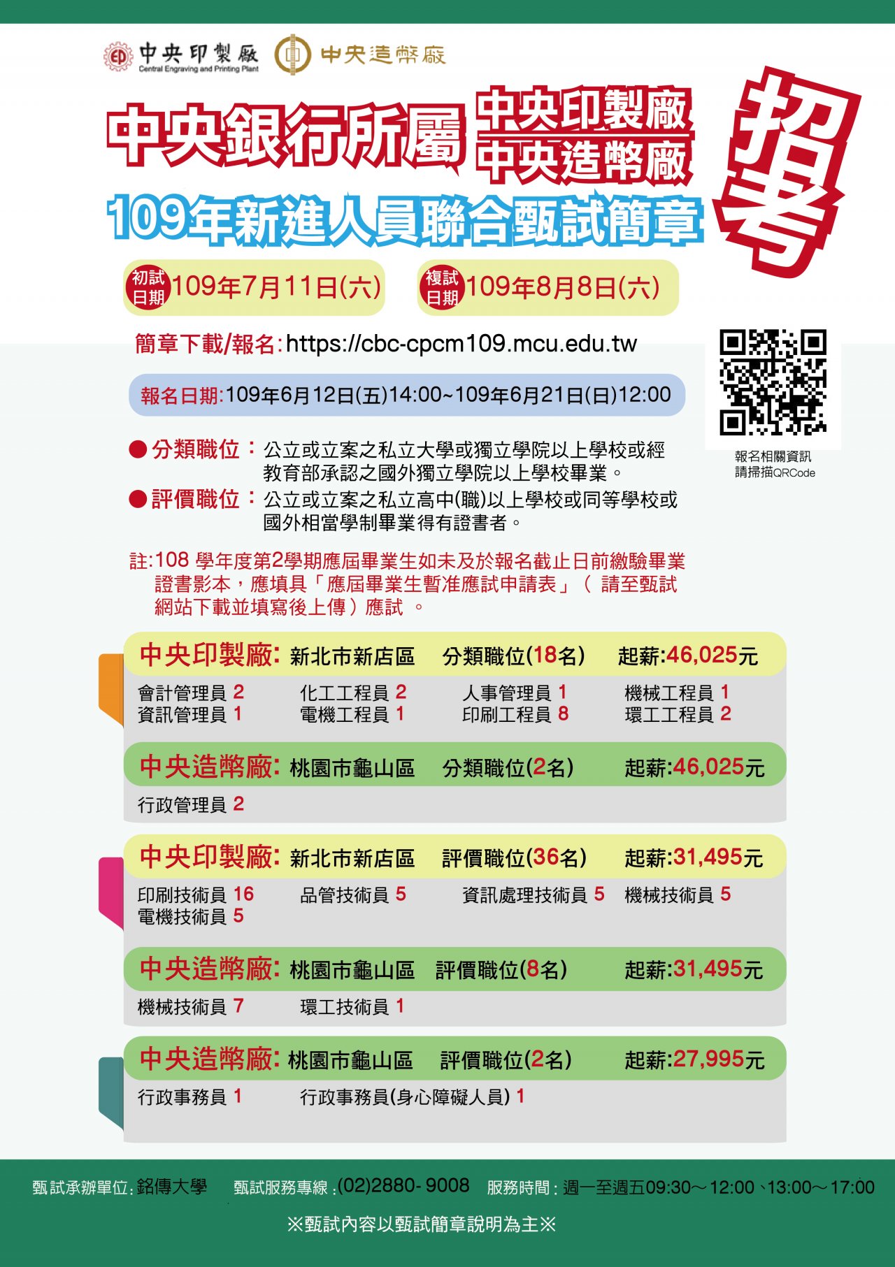 轉知:銘傳大學辦理中央銀行所屬中央印製廠、中央造幣廠109年新進人員聯合甄試簡章