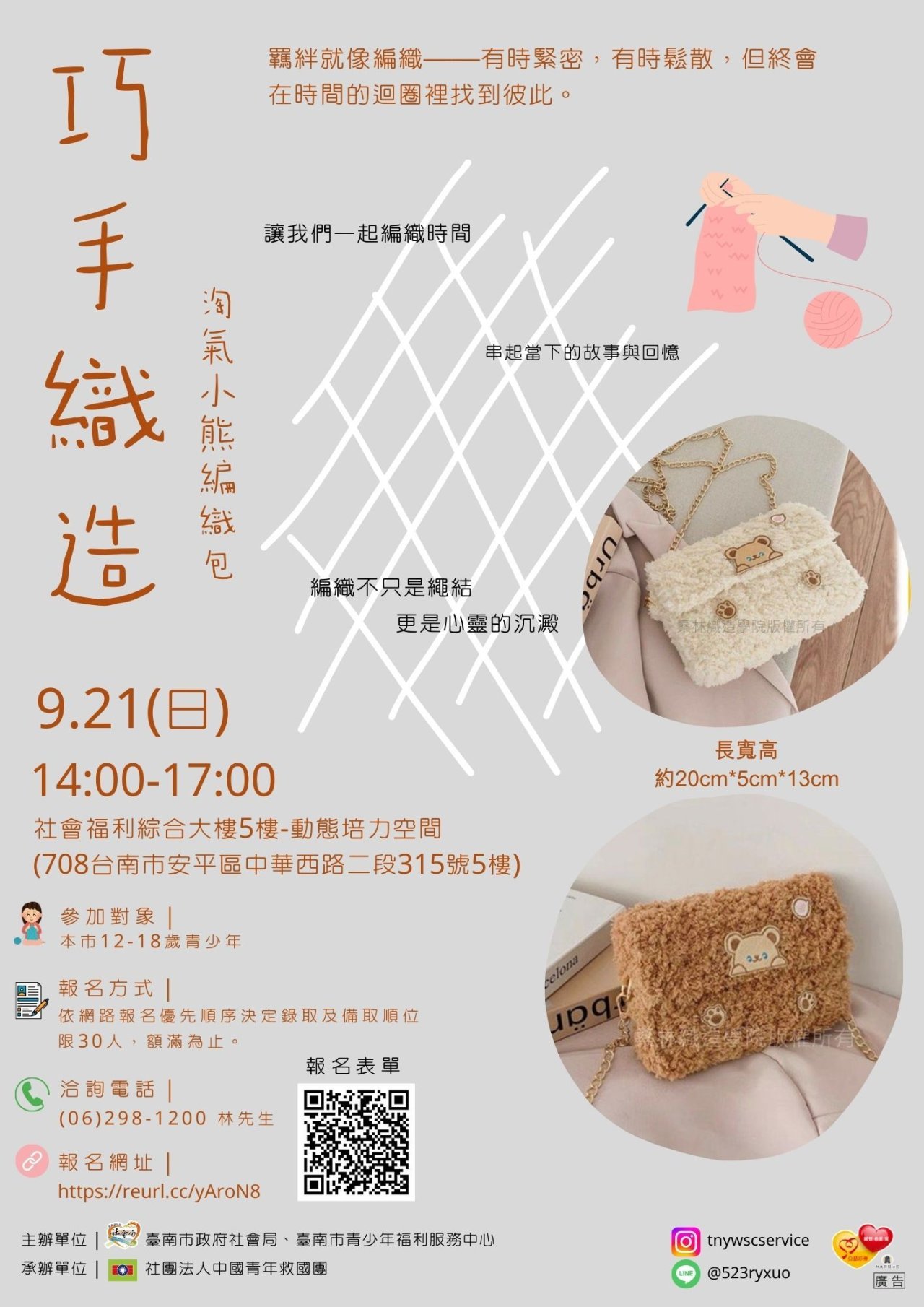 一針一線來織夢,臺南青少中心邀您 9 月 21 日一同創造屬於自己的絨毛小熊包,詳洽 06-2981200