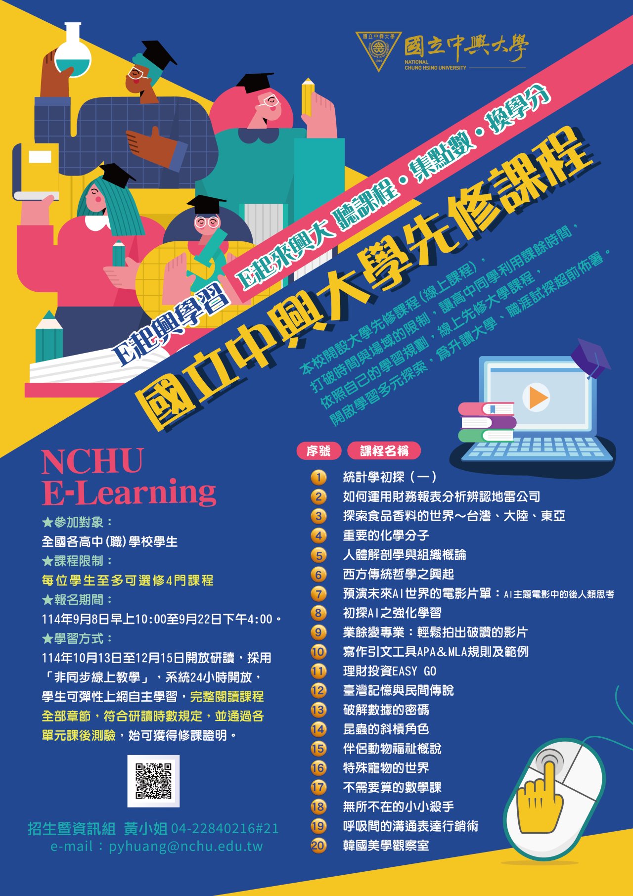 一、為協助高中職學生提前接觸大學課程,培養自主學習能力,並作為銜接大學課程及職涯探索之準備,本校特開設大學先修課程。