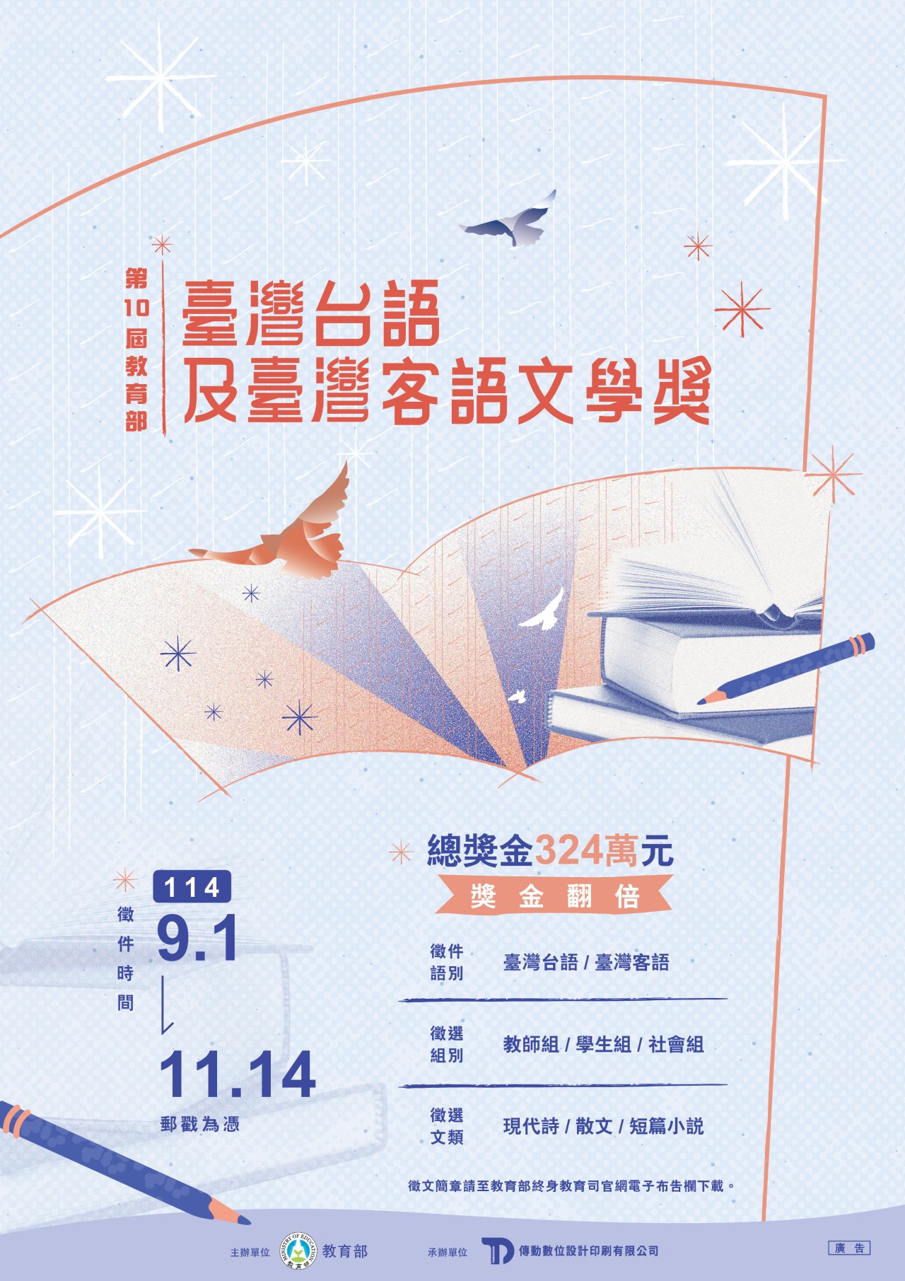 二、為使社會大眾了解多語並存之價值,保存臺灣本土語言文化的多樣性,本部特舉辦旨揭活動,活動徵文時間原為 114 年 9 月 1 日起至 114 年 10 月 31 日止,為鼓勵各界踴躍參加,將徵文時間延長至 114 年 11 月 14 日(星期五)。