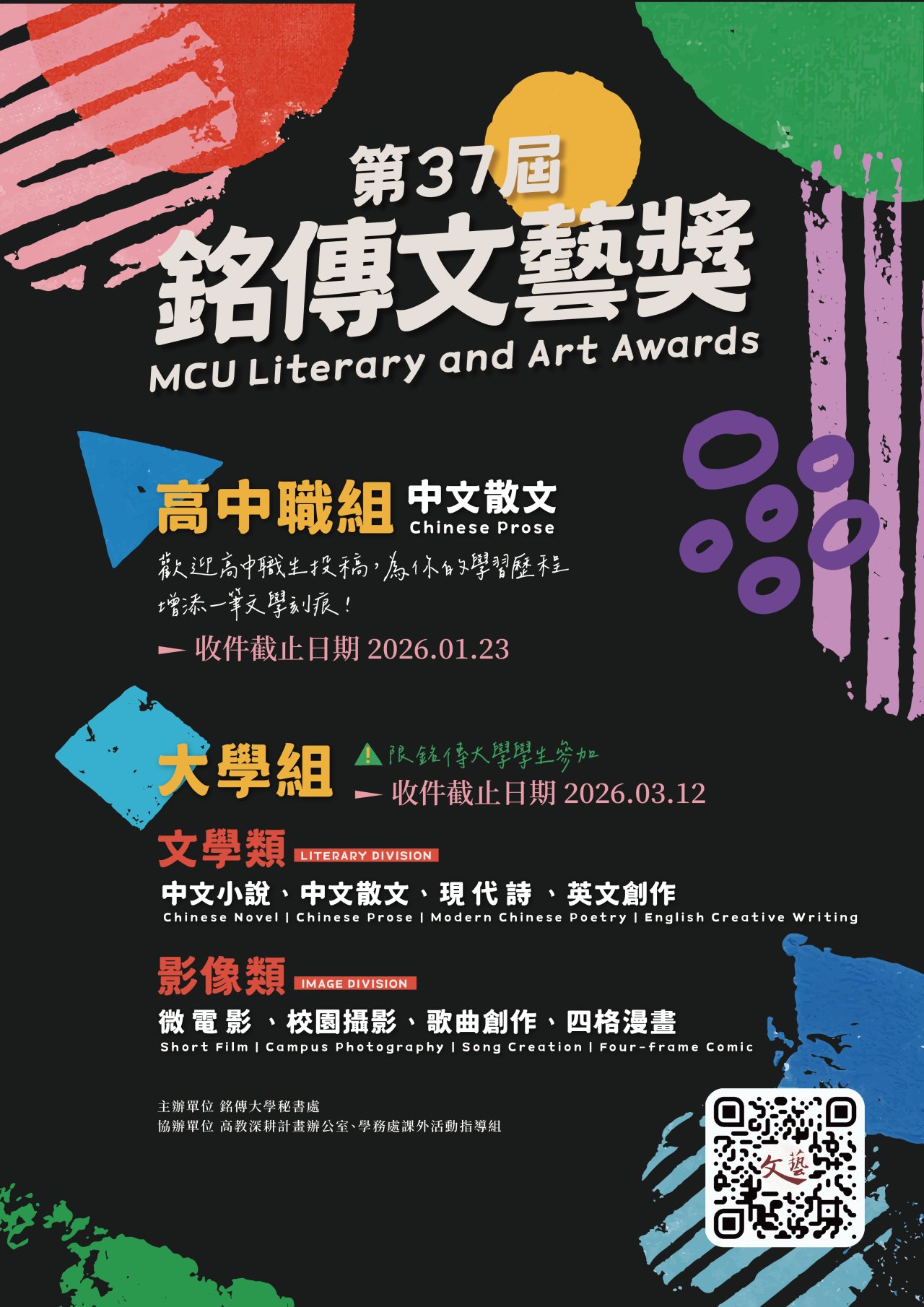 一、為提倡寫作風氣,提昇學生文學創作素養,培育文藝人才,本校由秘書處主辦「第 37 屆銘傳文藝獎」,並設立高中職中文散文組。