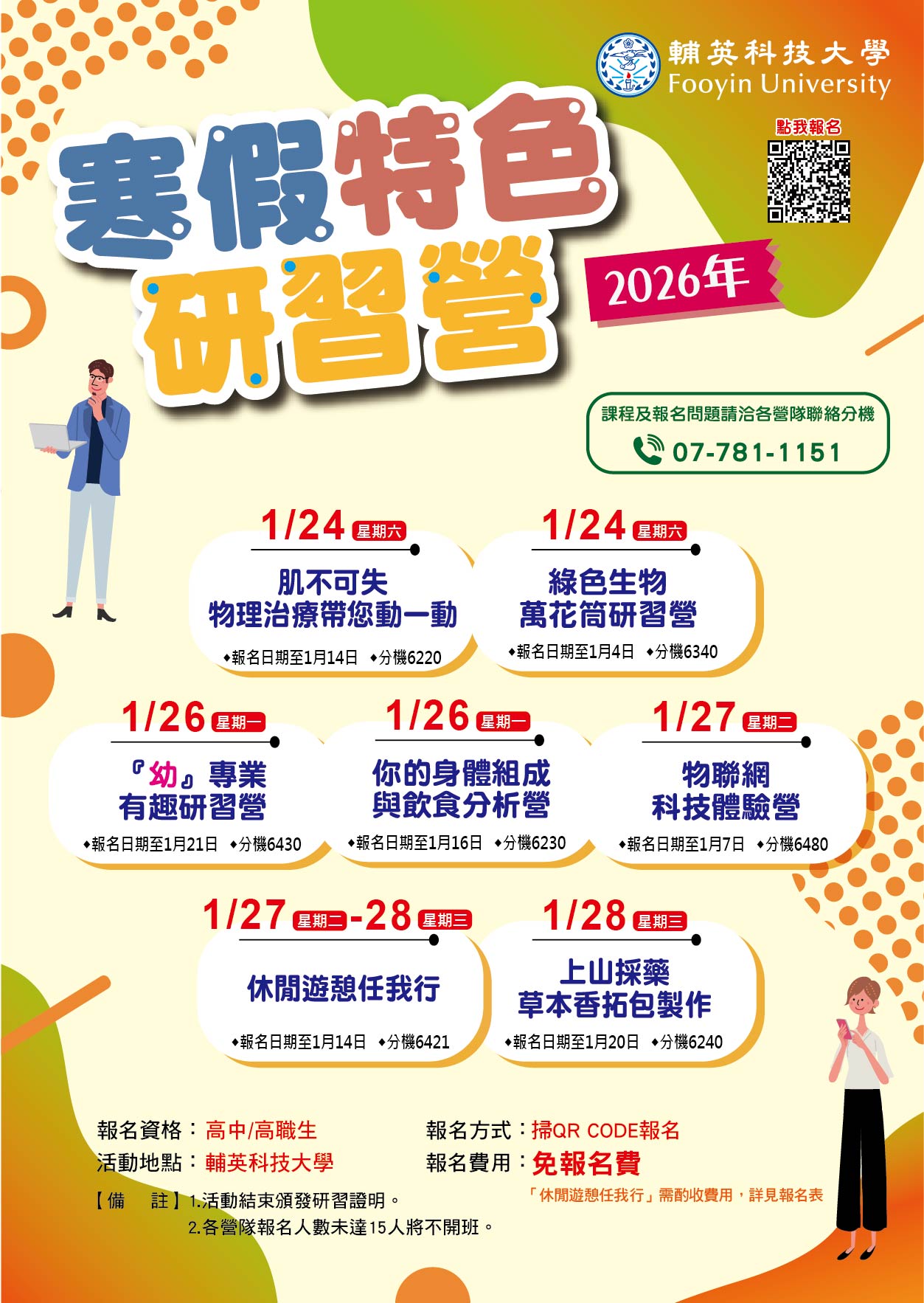 (四)報名方式:請掃描海報上 QR CODE 或至輔英科技大學首頁/招生資訊網/研習營連結網址報名。