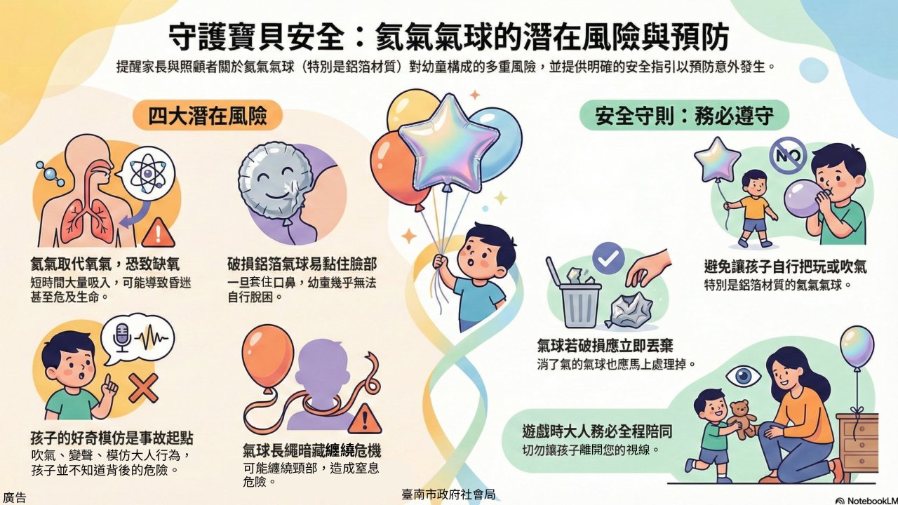 二、有鑑於近日本市發生兒童玩氦氣氣球意外,造成缺氧昏迷,幸經即時送醫才保住生命,為提高家長及兒少對於造型氣球的風險辨識能力,預防類似事故再次發生,本府社會局已製作「守護寶貝安全-氦氣氣球的潛在風險與預防」圖卡。