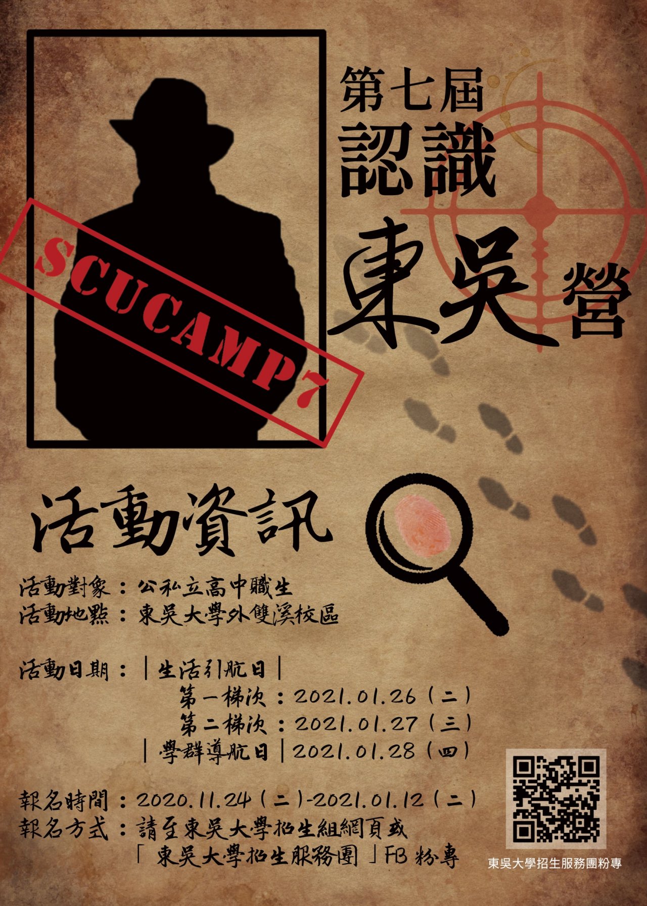 五、活動說明及海報請參考附件 1 與附件 2 。最新資訊公告於本校招生組網頁及「東吳大學招生服務團」粉絲專頁。名額有限,請提醒學生及早報名,以免向隅。