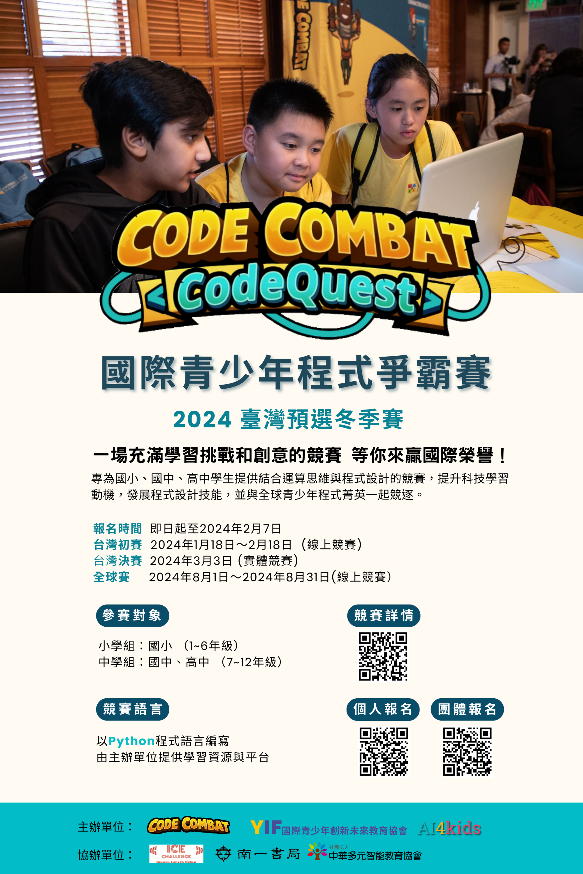 一、2024年寒假,國際青少年創新未來教育協會攜手AI4kids、南一出版社、中華多元智能教育協會,為8~18歲的國小、國中、高中學生提供結合課綱運算思維與程式設計的競賽機會,提升科技學習動機,發展程式設計技能,並與國際程式高手競逐。