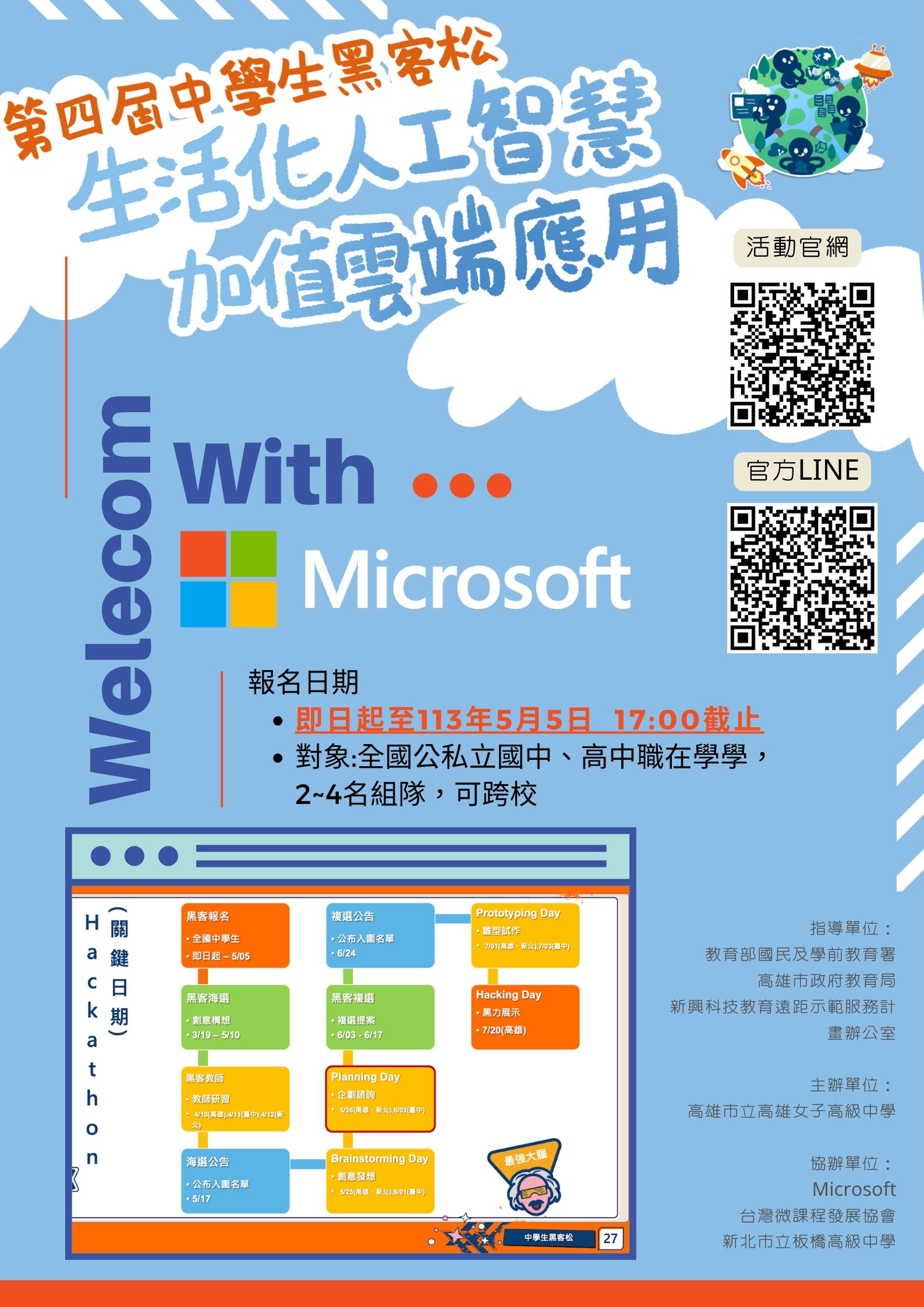 (二)本屆中學生黑客松挑戰日活動以實體方式為主,報名自即日起至113年5月5日(星期日)下午5時止,不收取報名費。