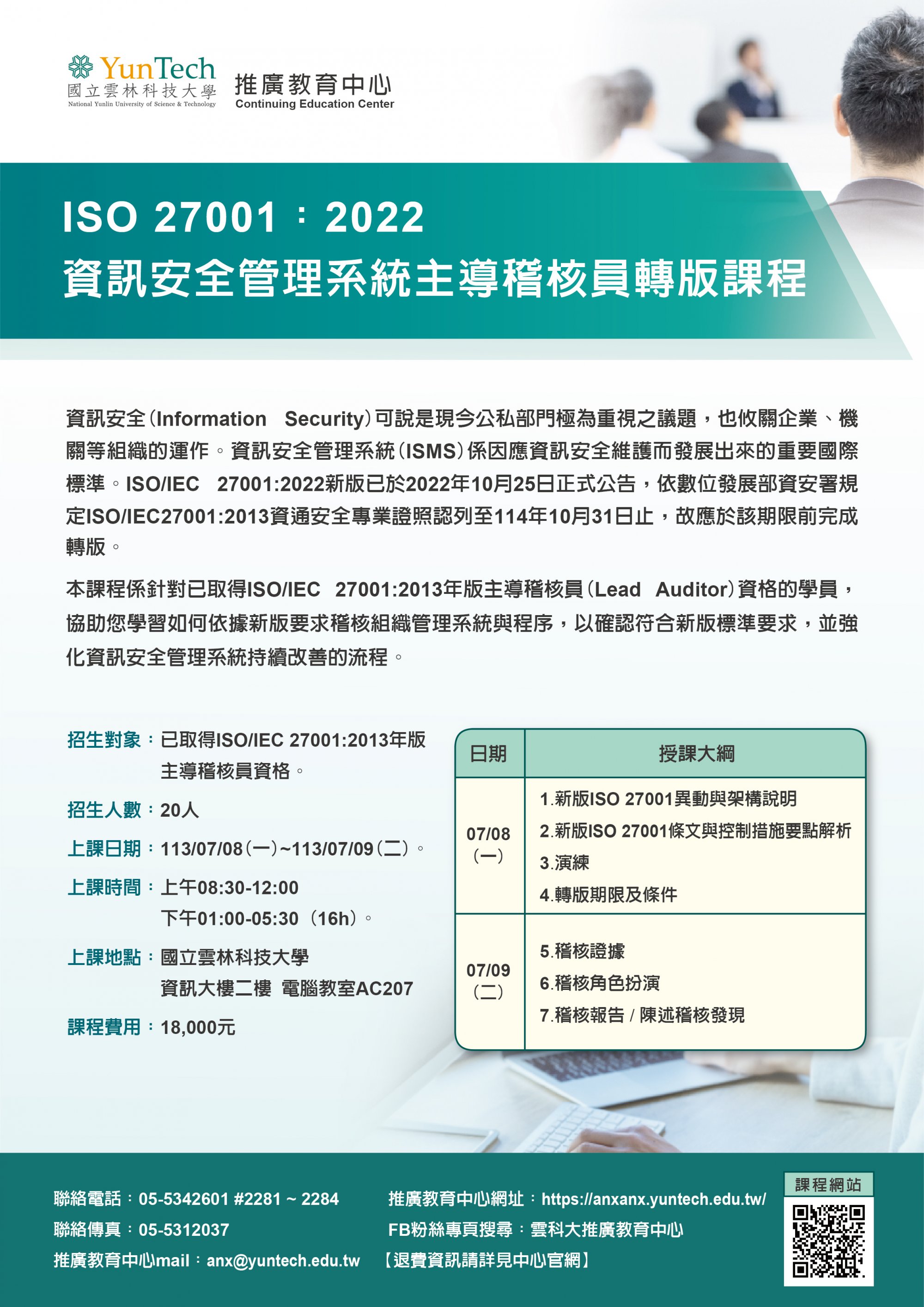 六、報名網址:本校【ISO 27001:2022資訊安全管理系統主導稽核員轉版課程】報名網址:https://reurl.cc/gGYm37。