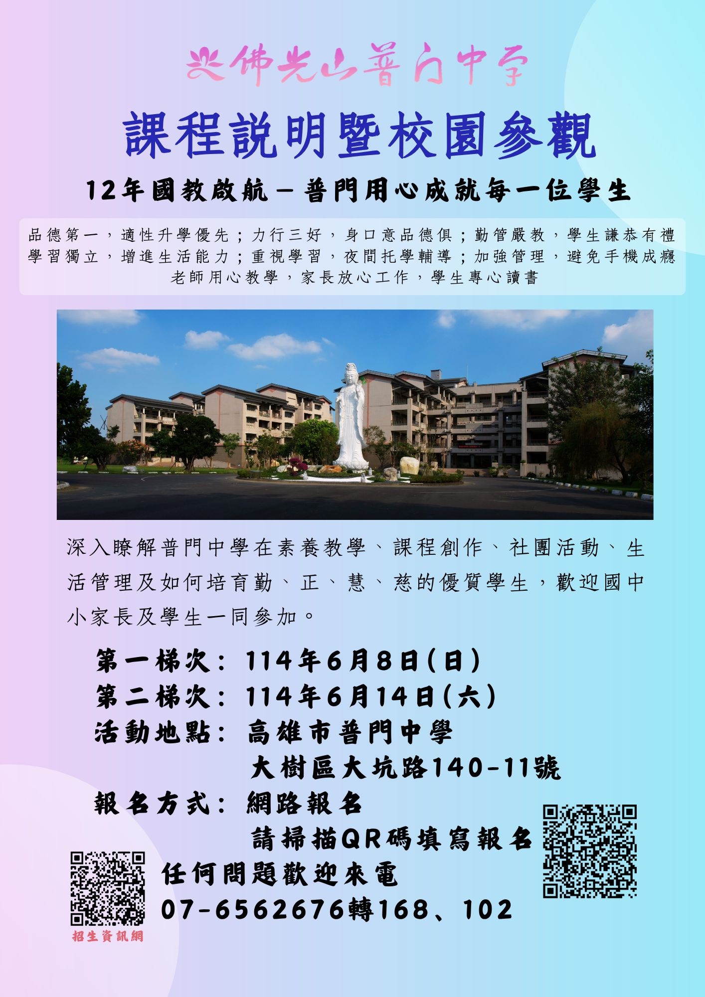 一、本校為一所住宿型學校,為提供國三畢業生及家長認識普門中學學習及住宿環境、課程與活動,讓即將就讀高中高職的孩子及家長能有更多的選擇,特別規劃招生活動--校園參觀暨課程說明會,歡迎國三畢業生的家長及學生參加。