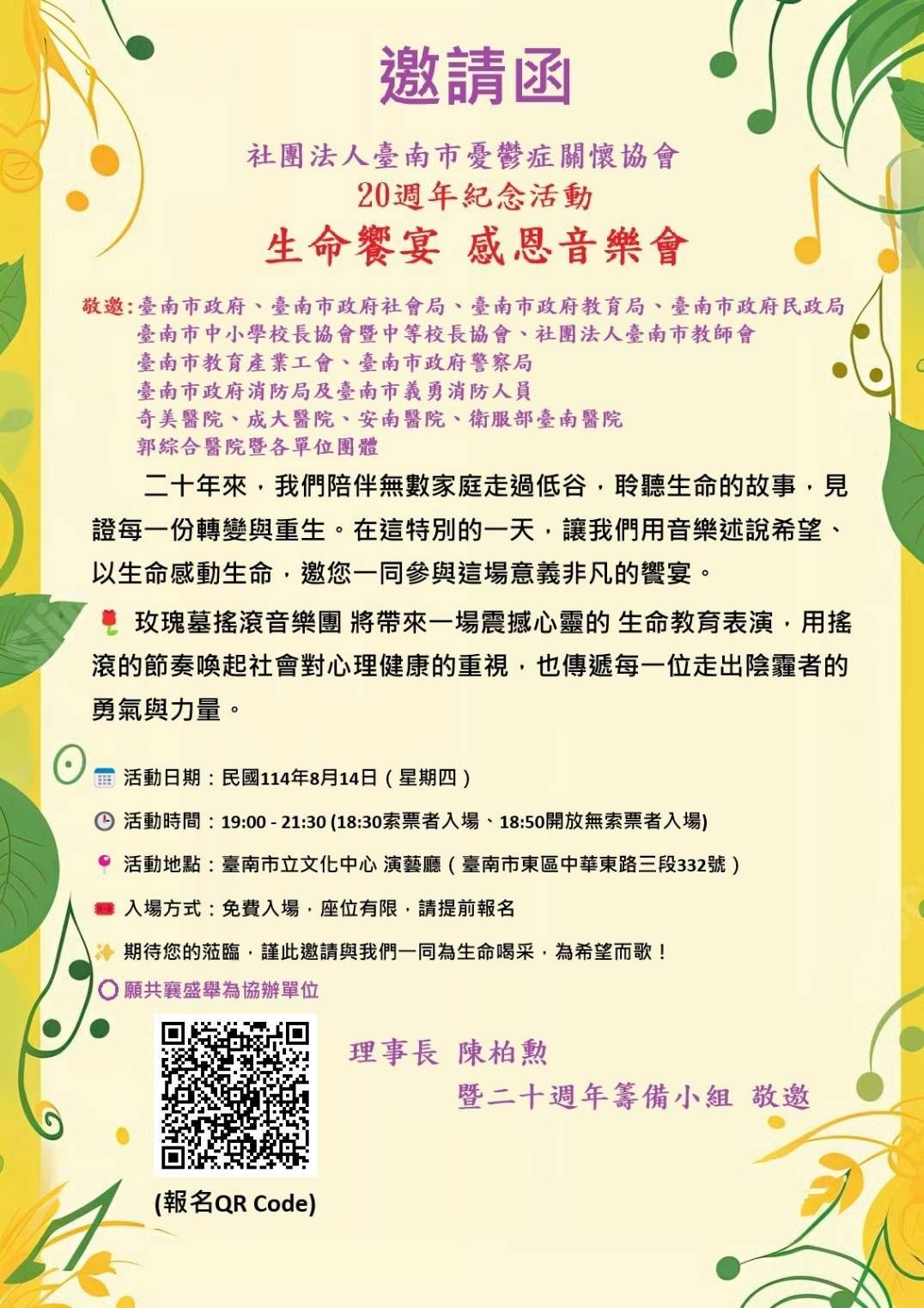 、依據財團法人臺南市憂鬱症關懷協會(下稱憂協)20週年紀念活動─生命饗宴 感恩音樂會邀請函。