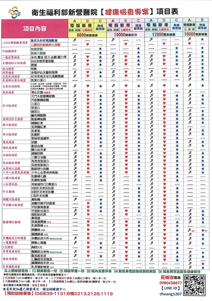 轉知衛生福利部新營醫院及臺南醫院提供之員工健檢專案,相關健檢適用對象及健檢內容請參閱附件