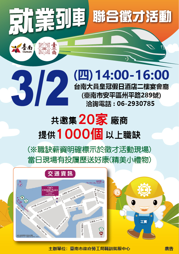 該中心將於112年3月2日(週四)下午2時假安平區台南大員皇冠假日酒店二樓宴會廳(安平區州平路289號)辦理「就業列車聯合徵才活動」。當日有20家廠商,提供逾1,000個工作機會;現場還有投履歷送好康,詳洽:06-2930785。