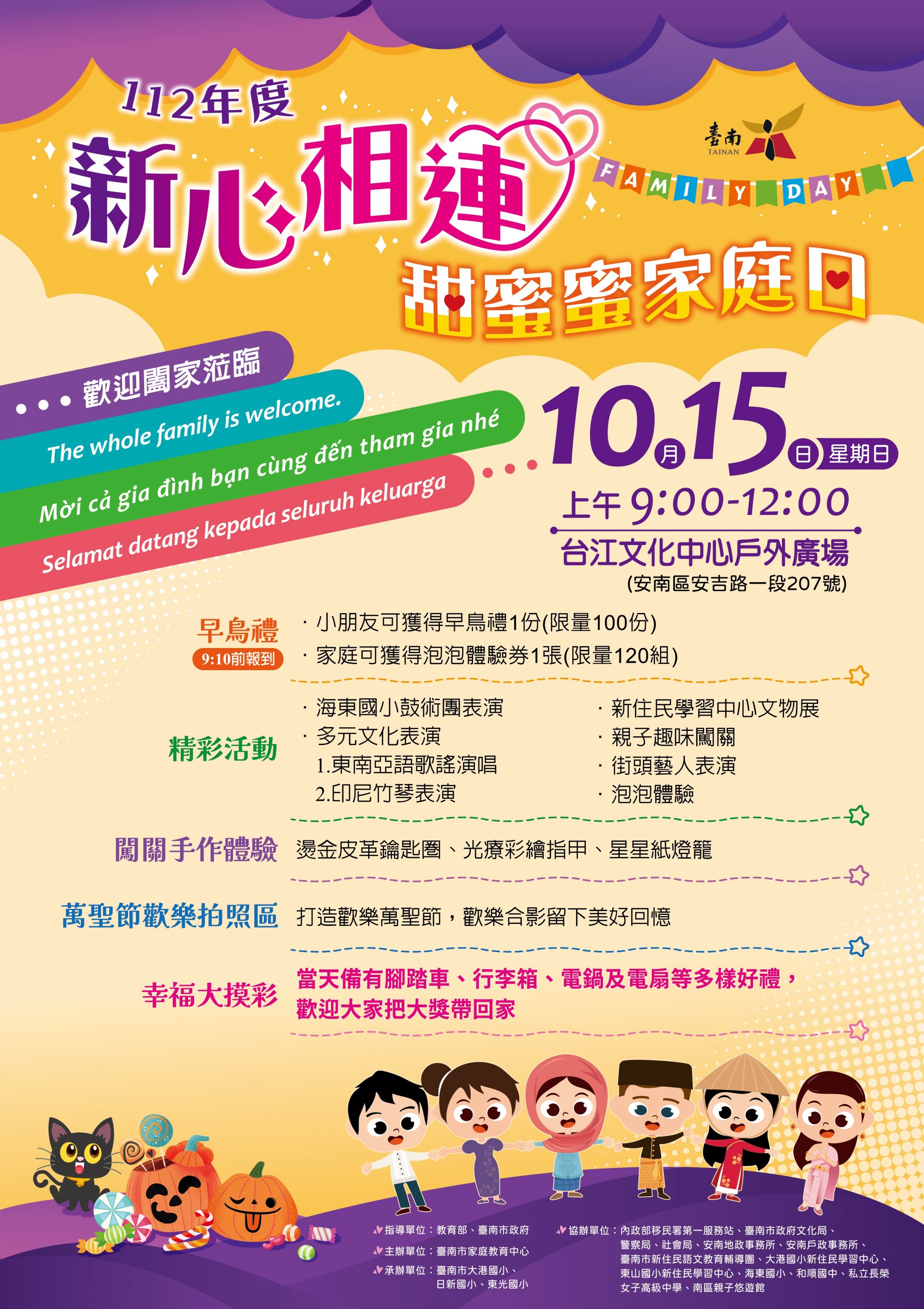 (三)內容:開場活動鼓術團表演、多元文化表演、親子闖關活動、萬聖節歡樂拍照區、闖關手作體驗、泡泡體驗、甜蜜蜜糖果分享及幸福大摸彩等,完成闖關即送精美禮物1份。