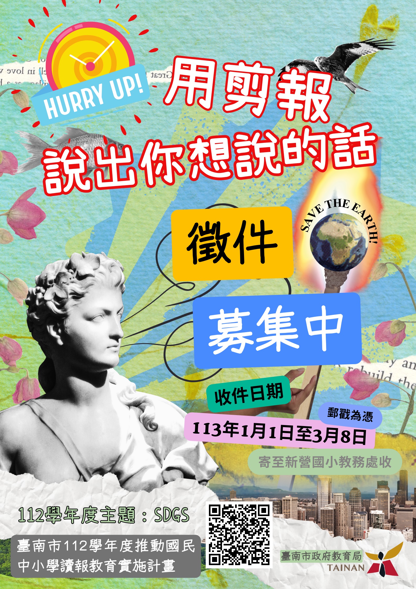 (4)收件日期:113年1月1日~3月8日(以郵戳為憑)。郵寄地址:臺南市新營區新營國小教務處收。活動洽詢電話:(06)6322136#102教務處。