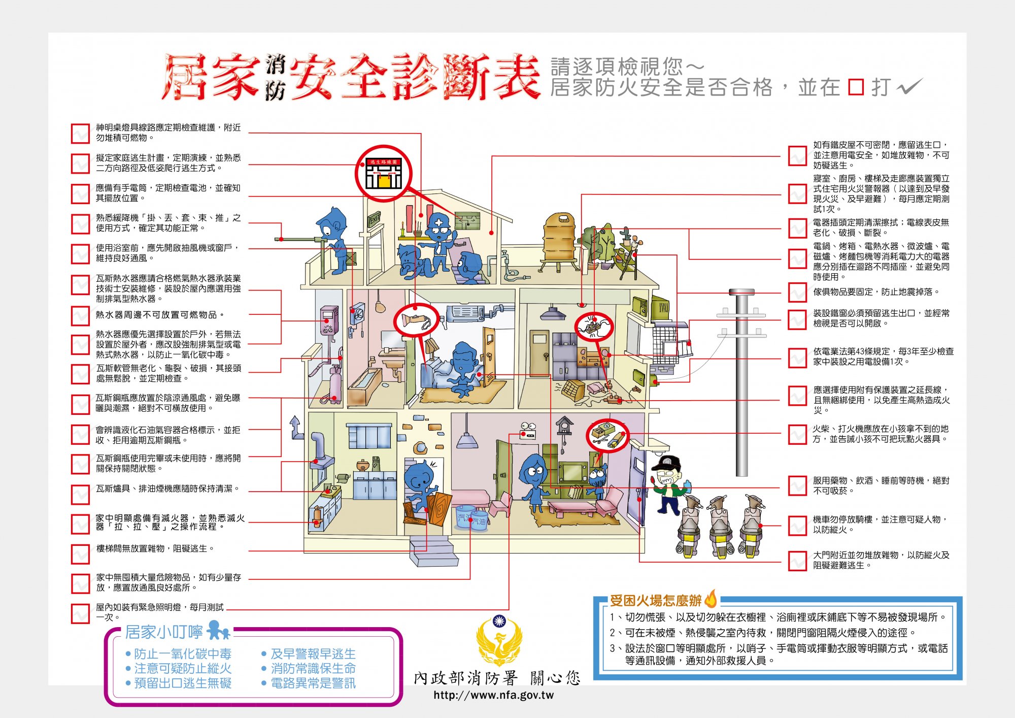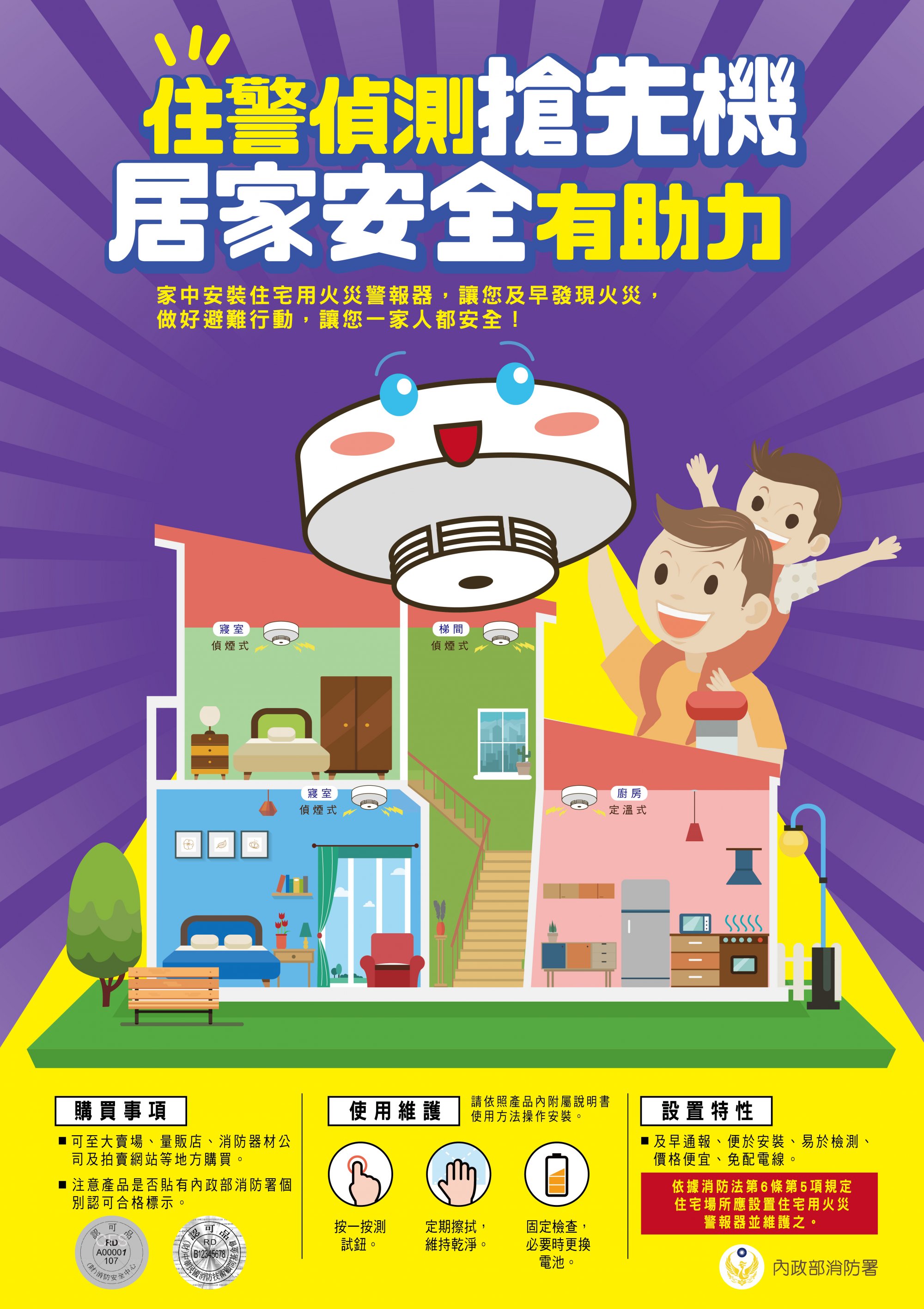 設置住警器能偵知火災及發出警報聲響的功能,輔助民眾第一時間發現火災,並立即採取逃生行動,提升保護全家人及自身的生命安全機會。