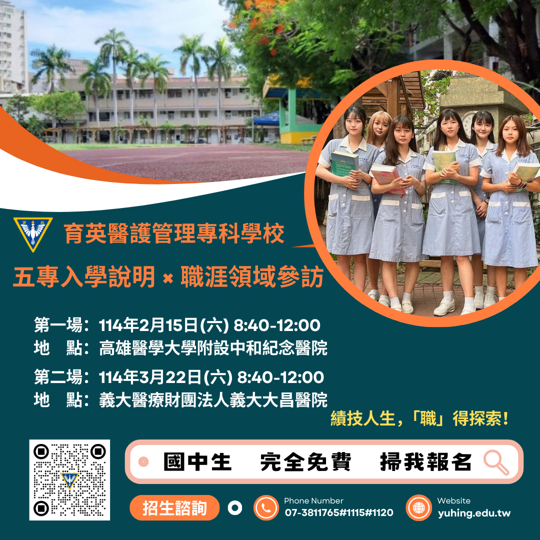 六、洽詢電話:(07)381-1765#1115或1120育英醫專教務處綜合業務組。