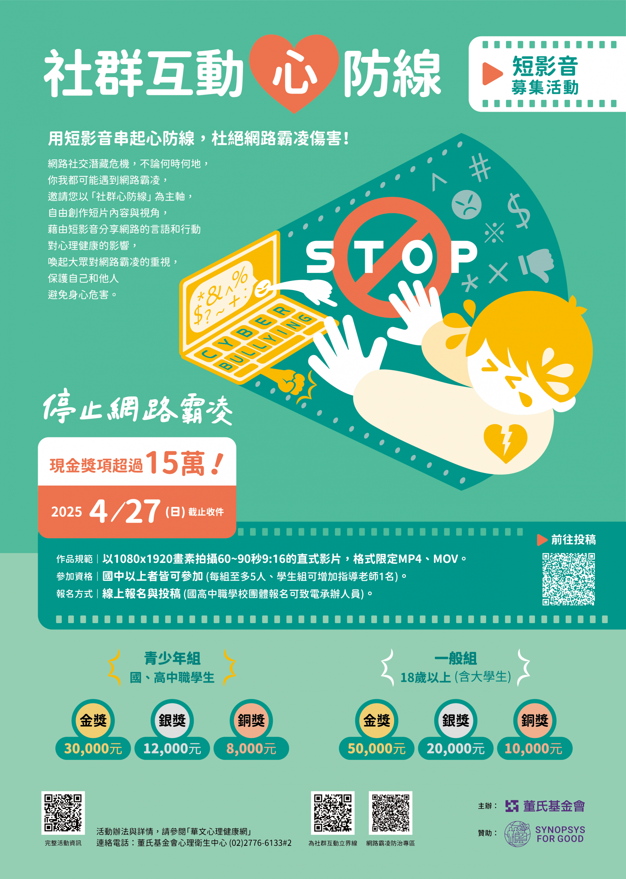 說明:為鼓勵青少年透過活動參與了解預防網路霸凌傷害的重要性,本會今年舉辦「社群互動”心”防線」停止網路霸凌短影音募集活動,即日起開始收件至民國114年4月27日止,邀請學生與民眾拍攝60-90秒直式短影音投稿,得獎作品可獲得獎金,青少年組首獎現金三萬元、一般組現金五萬元。活動辦法請參閱 https://reurl.cc/1XRnzQ