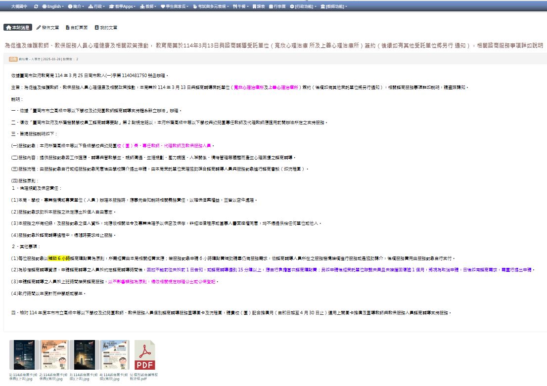 主旨:為促進及維護教師、教保服務人員心理健康及相關政策推動,本局業於 114 年 3 月 13 日與諮商輔導受託單位(寬欣心理治療所及上善心理治療所)簽約(後續如有其他受託單位將另行通知),相關諮商服務事項詳如說明,請查照轉知。