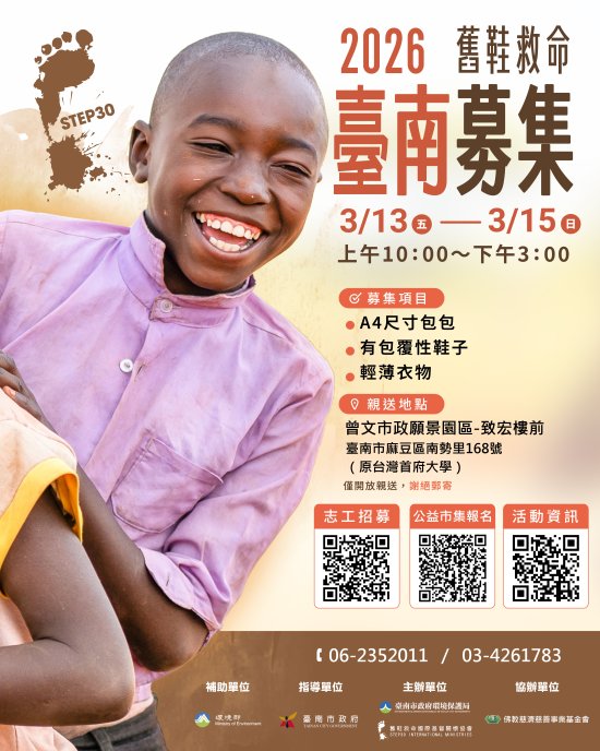主旨:本局謹訂於 115 年 3 月 13 日至 3 月 15 日假曾文市政願景園區(臺南市麻豆區 168 號)辦理「舊鞋救命臺南募集活動」,請惠予公告周知並鼓勵同仁踴躍捐贈物資及報名擔任志工,詳如說明,請查照。