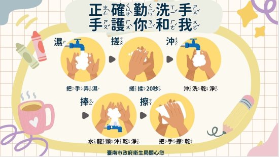 (二)正確勤洗手,手護你和我!腸病毒、流感等病毒經由手部傳播,正確洗手是最有效的預防方式!請記住洗手 5 步驟,用肥皂搓洗雙手至少 20 秒,讓細菌病毒無處可藏!守護自己與家人的健康,從洗手做起!