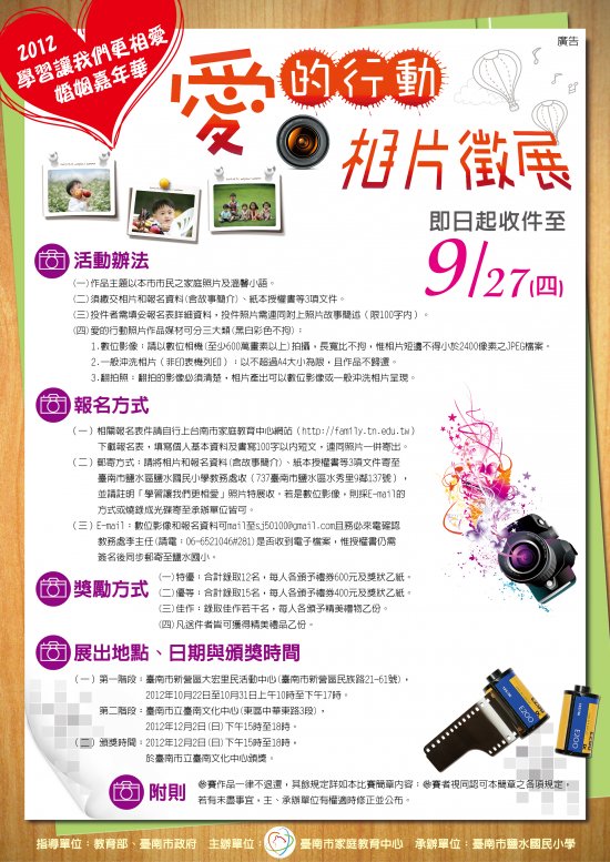 主旨:本市家庭教育中心「2012 年學習讓我們更相愛婚姻嘉年華─愛的行動照片徵展」訊息,惠請 公告週知。