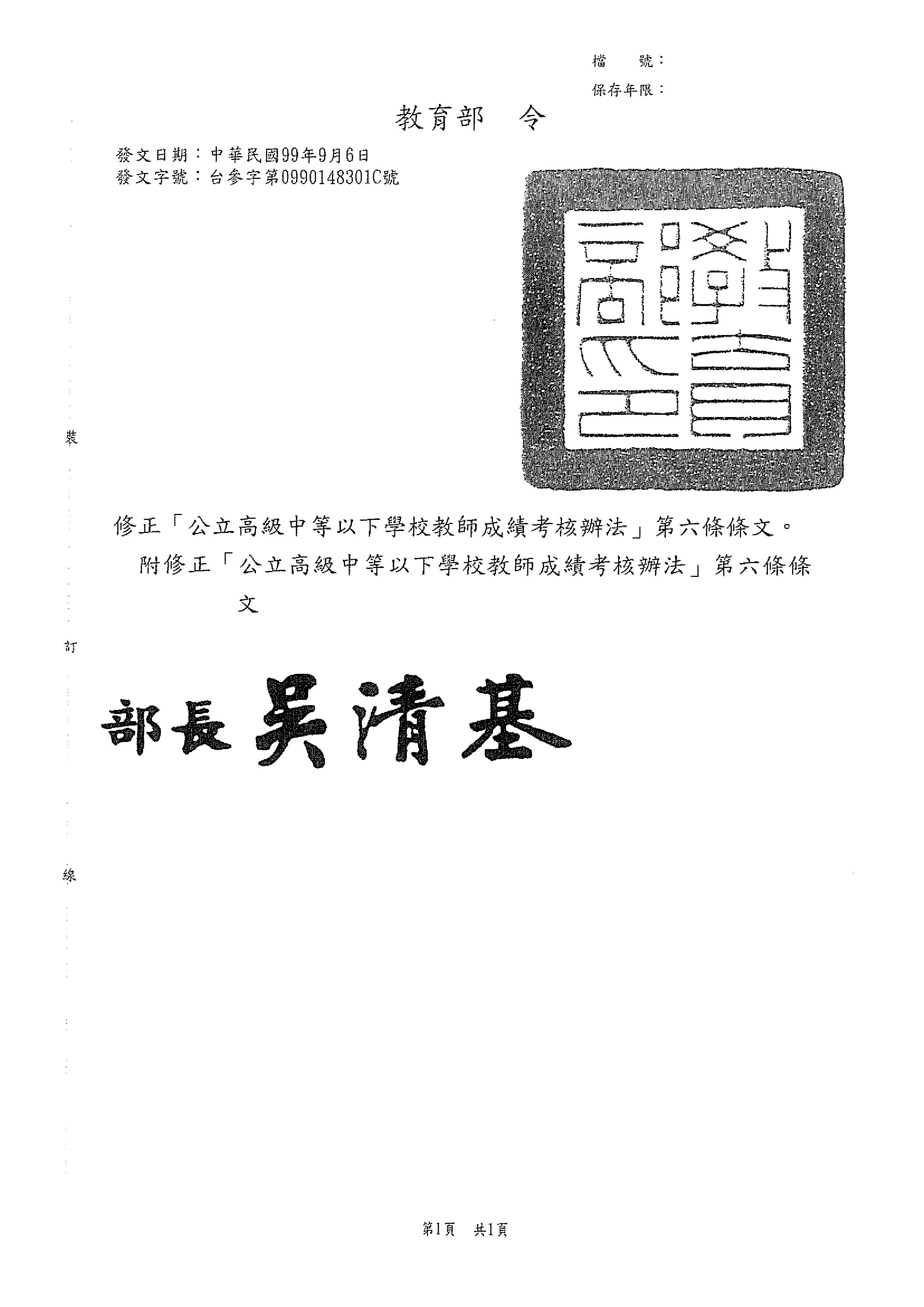 轉知教育部 99 年 9 月 6 日以台參字第 0990148301C 號令修正發布「公立高級中等以下學校教師成績考核辦法」第六條條文,詳如附件請參閱。