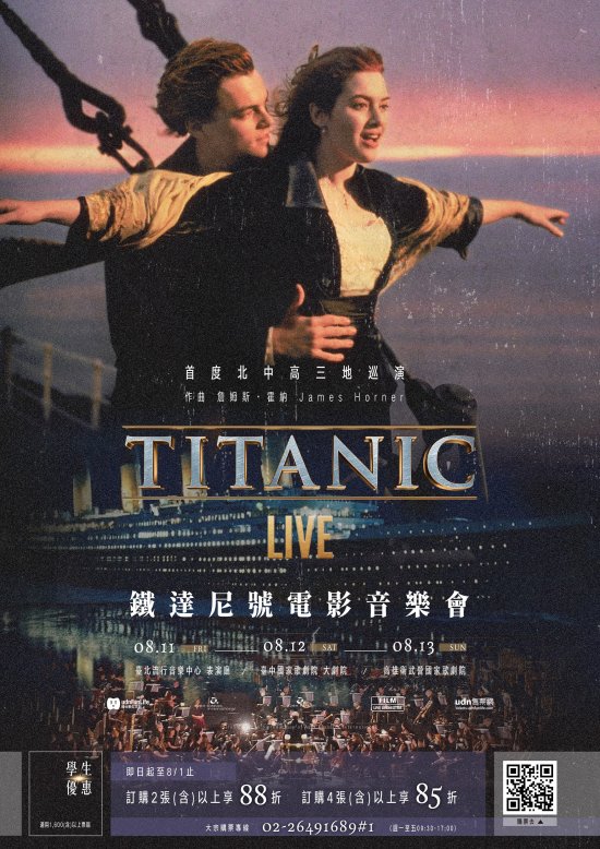 112 年 8 月 11 日(五)起至 112 年 8 月 13 日(日)於臺北流行音樂中心表演廳、臺中國家歌劇院大劇院、高雄衛武營國家歌劇院舉辦《鐵達尼號電影音樂會》