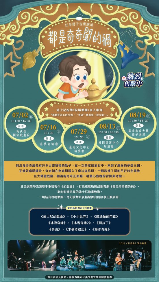 一、節目介紹:深受大小觀眾喜愛的狂美交響管樂團,與靖學表演聯手打造旗艦版魔幻歌舞劇《都是奇奇闖的禍》,透過現場真實動人之聲、顛覆想像的故事情節和創意玩轉經典,欲向影響世界的迪士尼動畫致敬,一場結合現場樂團、奇幻歌舞以及精緻舞台的故事正要展開!