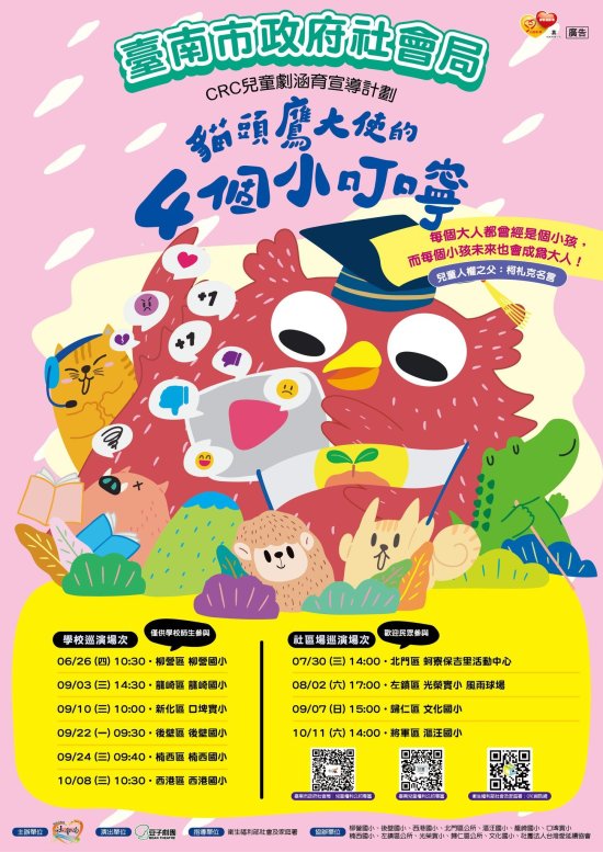 👣 即日起,《 CRC 社區巡迴劇場-貓頭鷹大使的四個小叮嚀》即將在臺南各地展開巡演!